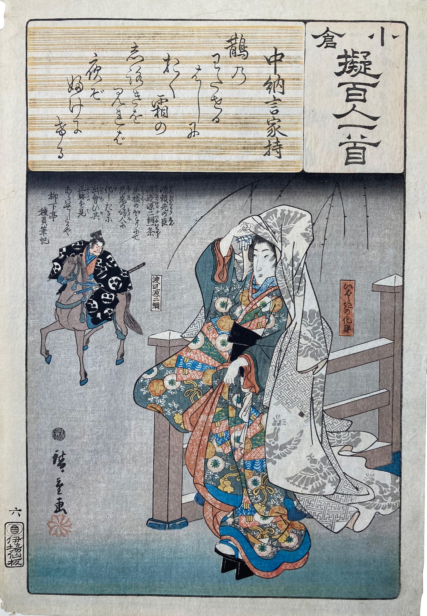 The Ibaraki Demon (Ibaraki no keshin) waiting by the bridge disguised as a young woman, and Watanabe Genji Tsuna, from the series "Ogura Imitations of One Hundred Poems by One Hundred Poets" (Ogura nazorae hyakunin isshu).