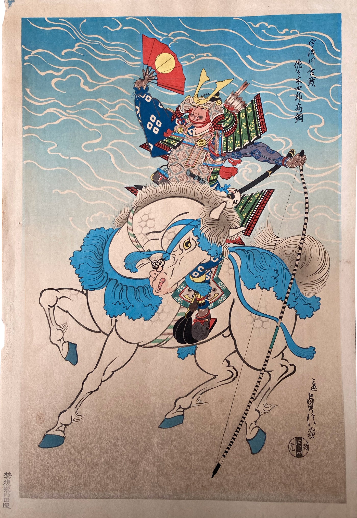 A posthumous woodblock print of Warrior Sasaki Takatsuna on a White Horse by Hasegawa Sadanobu III (長谷川貞信 (3代目) 1881–1963). This piece depicts a samurai on horseback. The print is titled in the upper right corner. The artist’s signature is printed in-block in the lower right corner alongside an Uchida publisher’s seal.