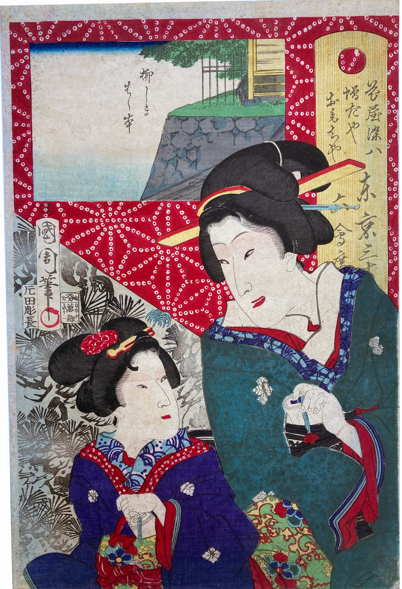 From the series “Thirty-six Famous Restaurants in Tokyo” which pairs famous geisha with famous Tokyo eateries. Somehachi Masudaya Mochiya restaurant. In the series, the square panel at top left shows either speciality dishes or views from the eatery. The large yellow cartouche on the right shows the series' title, name of the geisha and the restaurant's address. 東京三十六会席 花屋染八 増だや おもちや