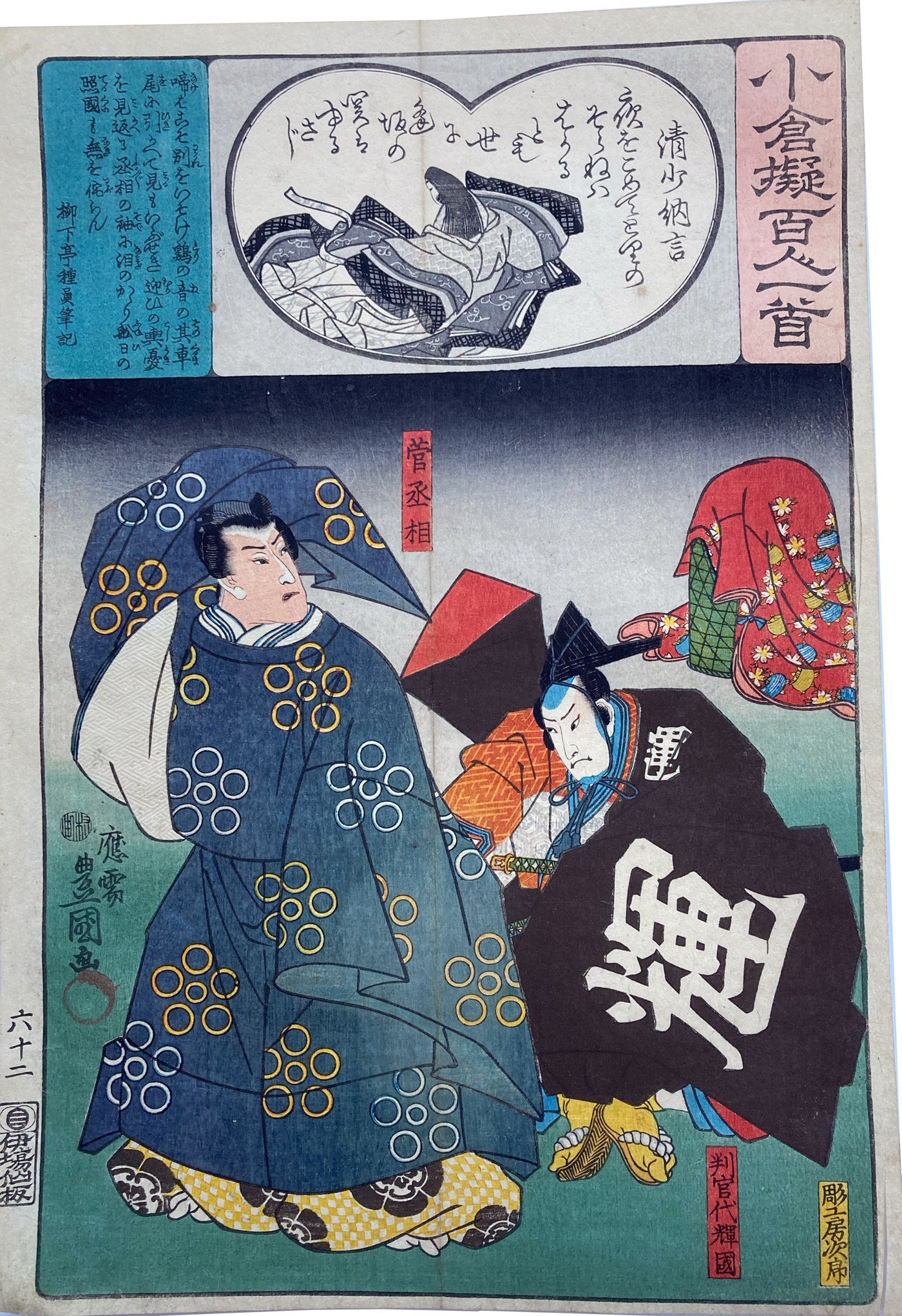 This print is by Utagawa, Kunisada, from the series “100 Poems by 100 Poets” a series jointly designed by Hiroshige, Kunisada, and Kuniyoshi.