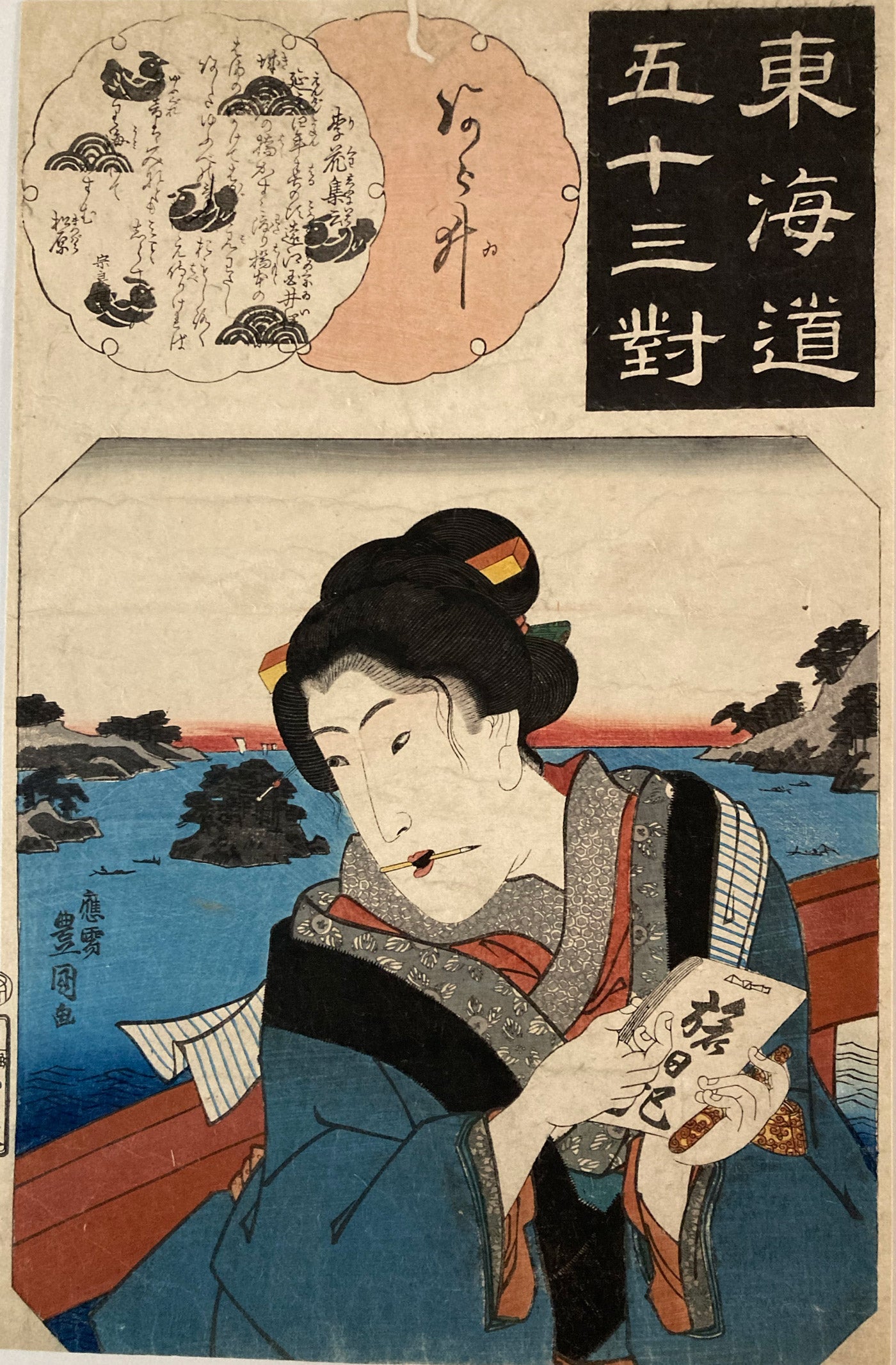 Arai. The Fifty-three Pairings for the Tokaido. There is a woman with a travel diary in her hand on the Hamana bridge. The woman has an Ohaguro and she has a brush in her mouth. Ohaguro is the custom to paint the teeth black and was common among aristocrats and married women in Japan.