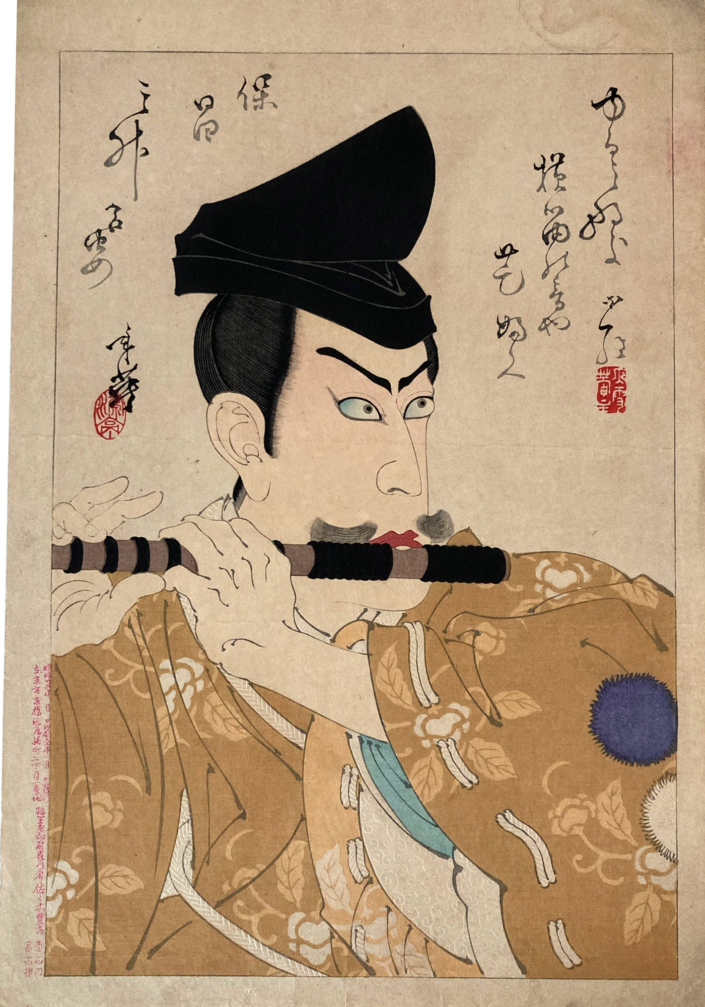 Migita was apprenticed to Tsukioka Yoshitoshi. Flute Player - Hirai Yasumasa, a famous flute player in Heian Court. Here, he was followed by a bandit named Hakamadare. Hakamadare was enchanted by the flute music and ended up following Yasumasa to his house. 三升合姿 保昌 年英画