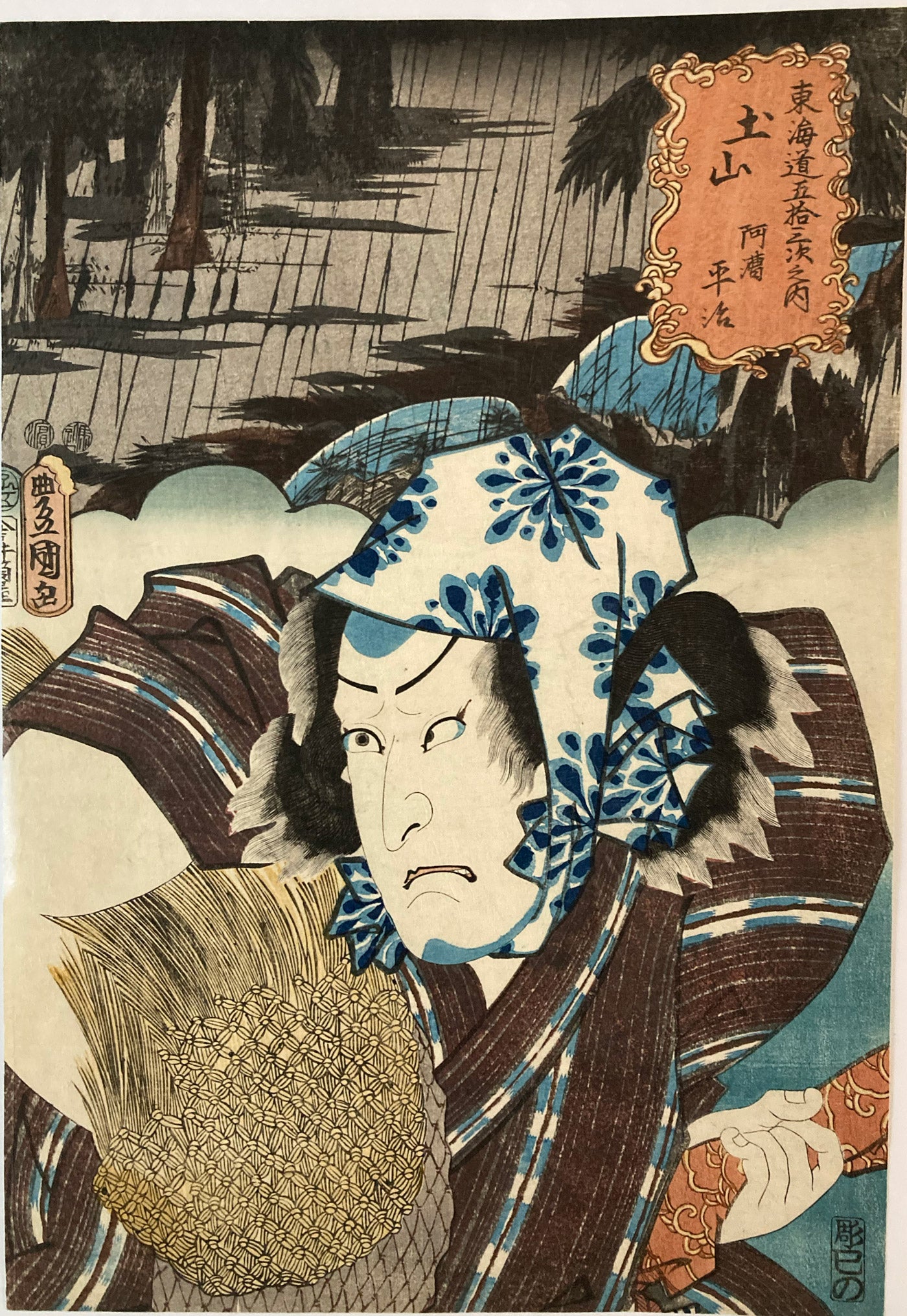Tsuchiyama: (Actor Ichikawa Kodanji IV as) Akogi Heiji, from the series Fifty-three Stations of the Tôkaidô Road. Akogi is running in the rain. In the background is Hiroshige's famous rain scene "Tsuchiyama".