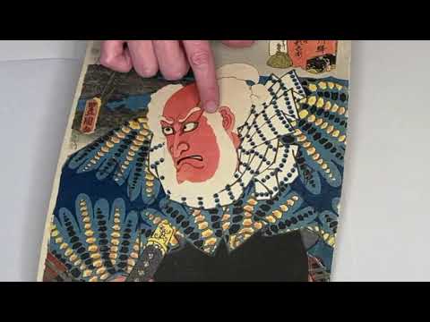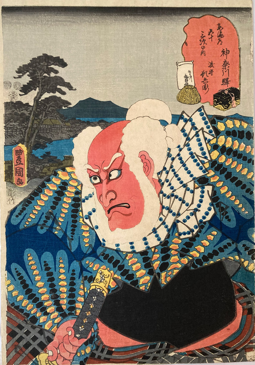 Toyokuni III's 1852 series "The Fifty-three Stations of the Tokaido" pairs kabuki portraits with the stations along the famous Tokaido Road. Each design features a half-length figure in the foreground, with a border of clouds separating the actor from the landscape above. Interestingly, the title cartouche of each print is framed by different objects related to the kabuki character or play, including armor and weapons, household objects, flowers, horse equipment, and traveler's clothing and baggage. The large expressive characters are beautifully drawn and detailed, with fine line work in the hair and soft bokashi shading in the backgrounds. (length 36.9 cm × width 25.8 cm).
