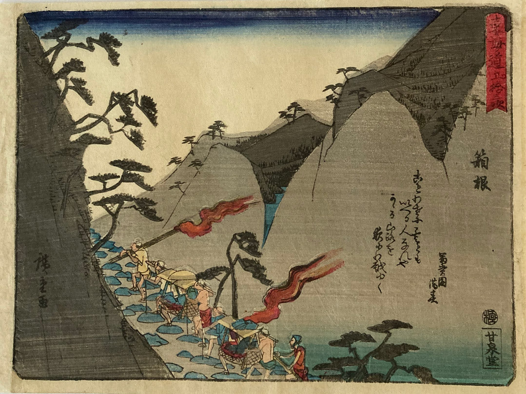 The Fifty-three Stations of the Tokaido Road Tōkaidō gojūsan tsugi no uchi 東海道六五十三次之内 Hakone, no. 11. Censor Seal: Kiwame. The palanquin carriers holding torches are climbing the steep mountain road in Hakone pass.