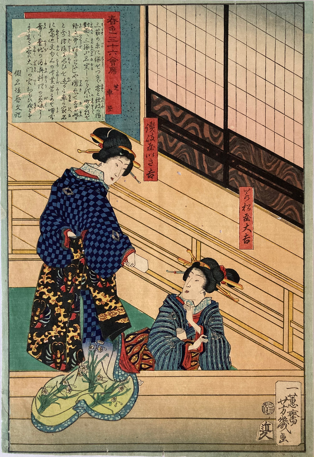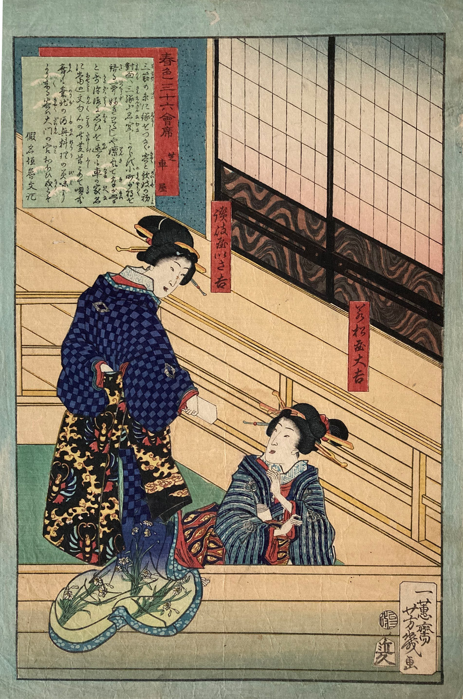 From the series Colors of Spring at Thirty-six Restaurants (Shunshoku sanjûroku kaiseki). We have 2 of these prints for sale, please specify which one you want. The price is the same for each.