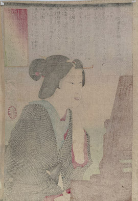 The title Mitate-tai-zukushi can be rendered as "Eves' Wishes and Hopes are compared to and alluded to what they are acquainted with." Here "Eves" are those women and ladies of classes from high and low. Some are new women and others remain in the old profession, but hopeful to venture into their own new selves. (Thanks to Mariko Shimizu for the translations).