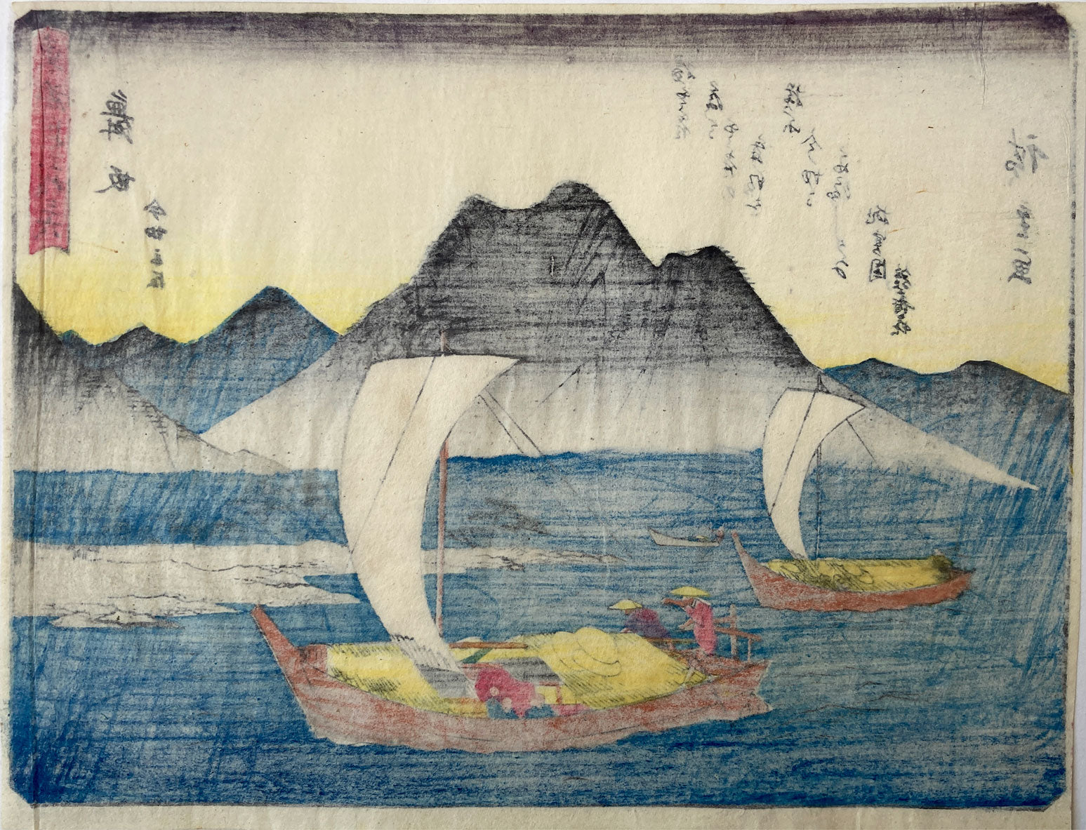 Maisaka station from "Tokaido Goju-san Tsugi" 東海道五十三次 ("Fifty-three Stations of Tokaido"), Each print in this series has a short comic poem (in Japanese: "kyoka"). Hence this series is known as the Kyoka Tokaido - also known as the Sanoki Tokaido after the publisher.