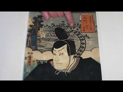 Toyokuni III's 1852 series "The Fifty-three Stations of the Tokaido" pairs kabuki portraits with the stations along the famous Tokaido Road. Each design features a half-length figure in the foreground, with a border of clouds separating the actor from the landscape above. Interestingly, the title cartouche of each print is framed by different objects related to the kabuki character or play, including armor and weapons, household objects, flowers, horse equipment, and traveler's clothing and baggage. The large expressive characters are beautifully drawn and detailed, with fine line work in the hair and soft bokashi shading in the backgrounds.