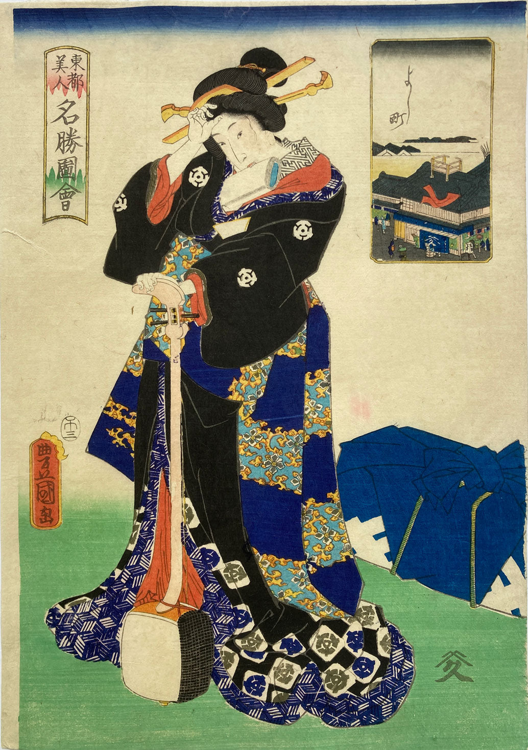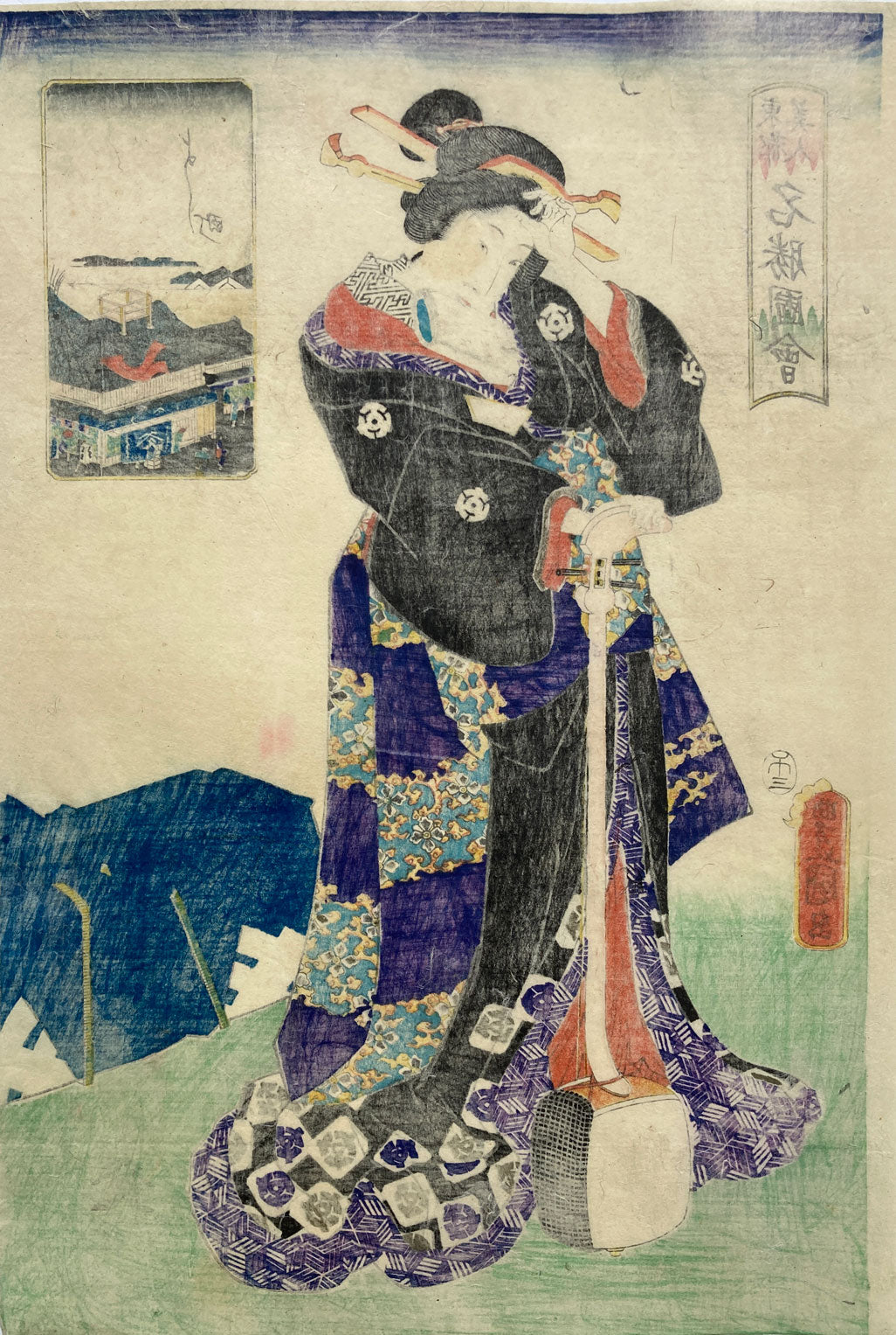 Yoshi-machi, from the series Beautiful Women at Famous Places in Edo. There is no signature on the inset, so presumably it is by Kunisada himself. A shamisen player just arrived at Yoshi-cho. The publisher, Yamamoto-ya, is depicted in "koma-e" (the small window). This series was probably produced due to the popularity of the "Famous Places in Edo Compared with 100 Beauties" series that is the same except for the title cartouche.