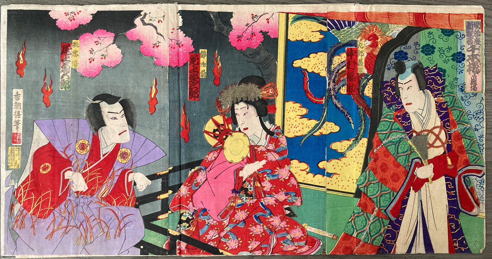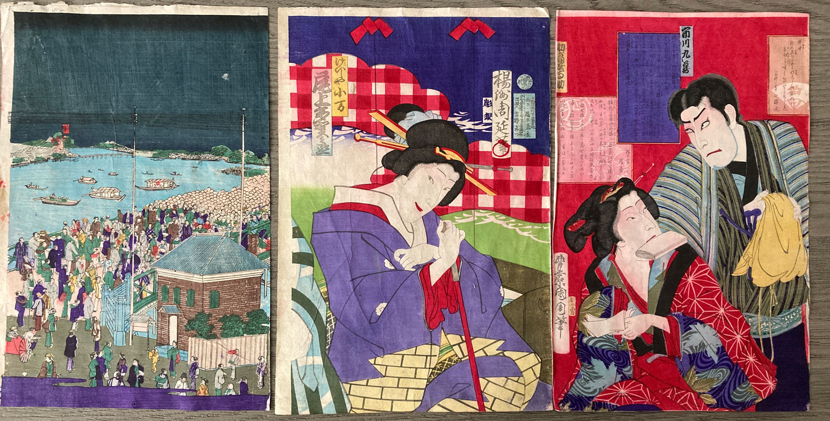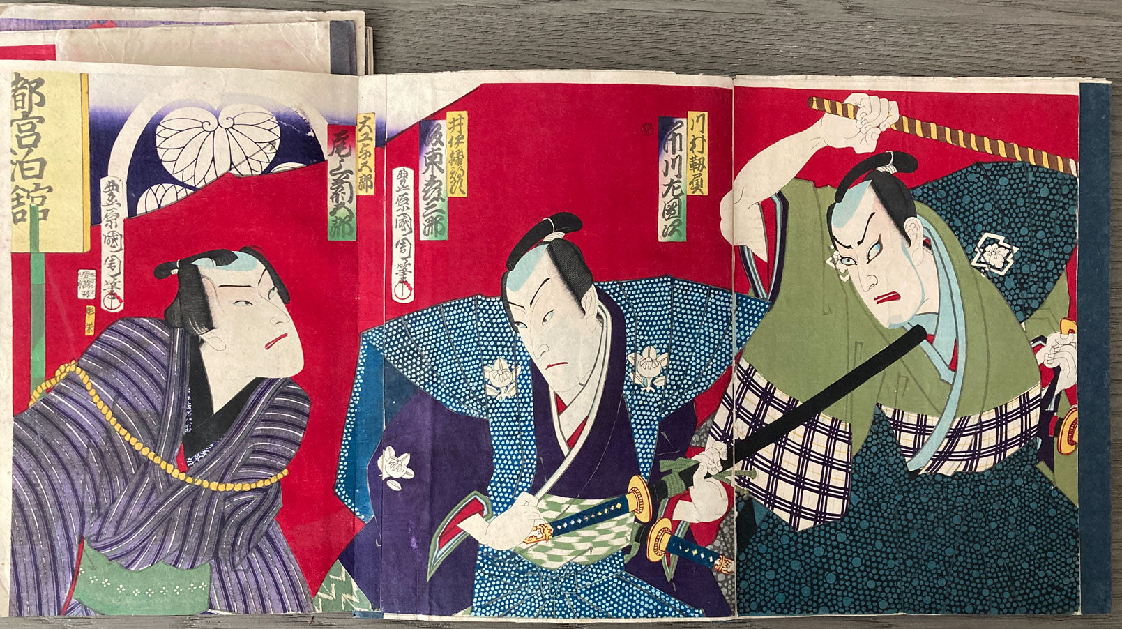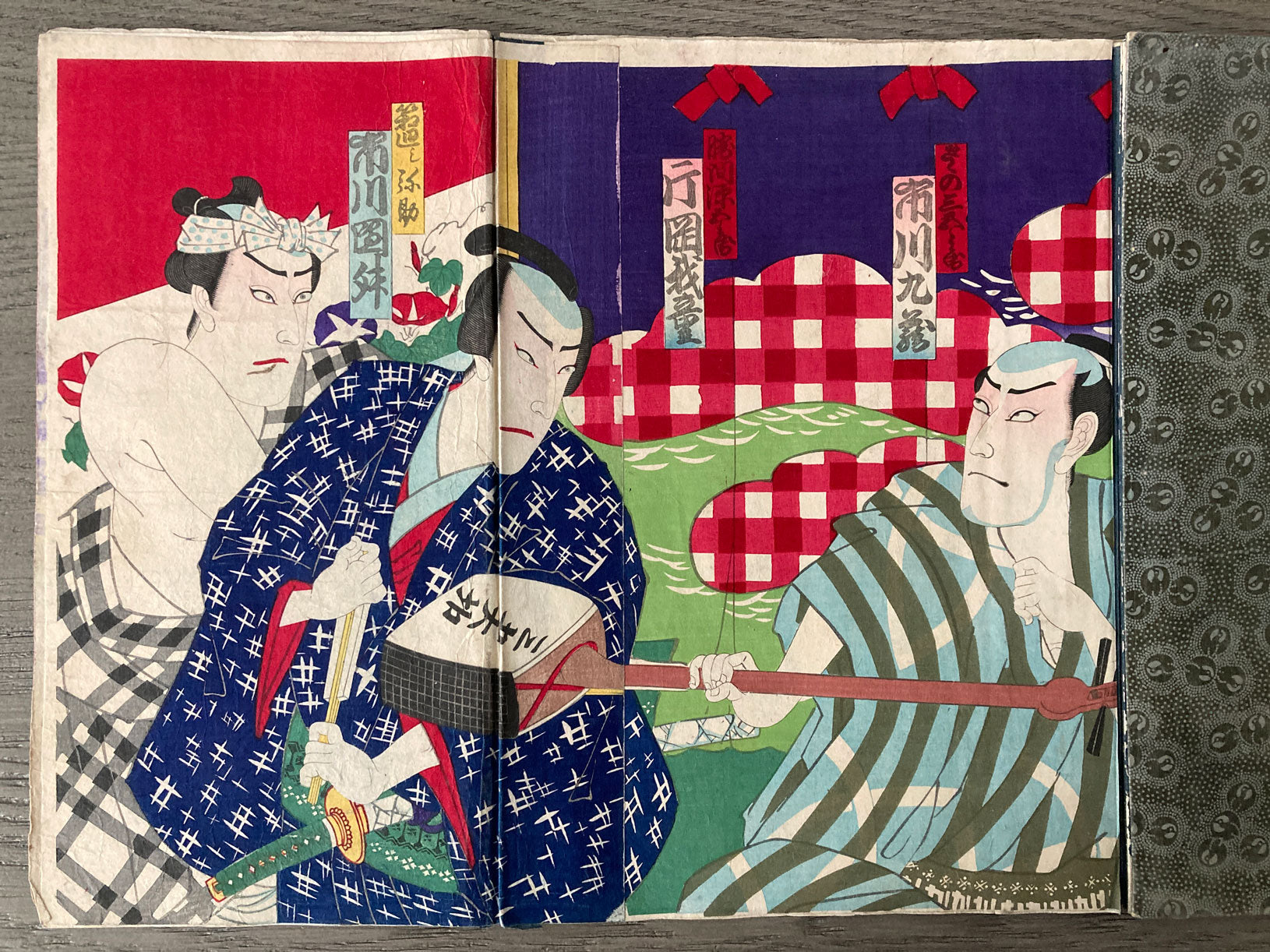 Loose pages from an original Meji Era album of prints. About 15 triptychs and diptychs. Artists include Chikanobu, Kunichika, Kunisada, and others. All pages are shown as is. You can see most of them are all glued down to the album pages, there are a couple of loose pages as well. Sorry for the condition but this is how we got it. All pages shown are included in the price.