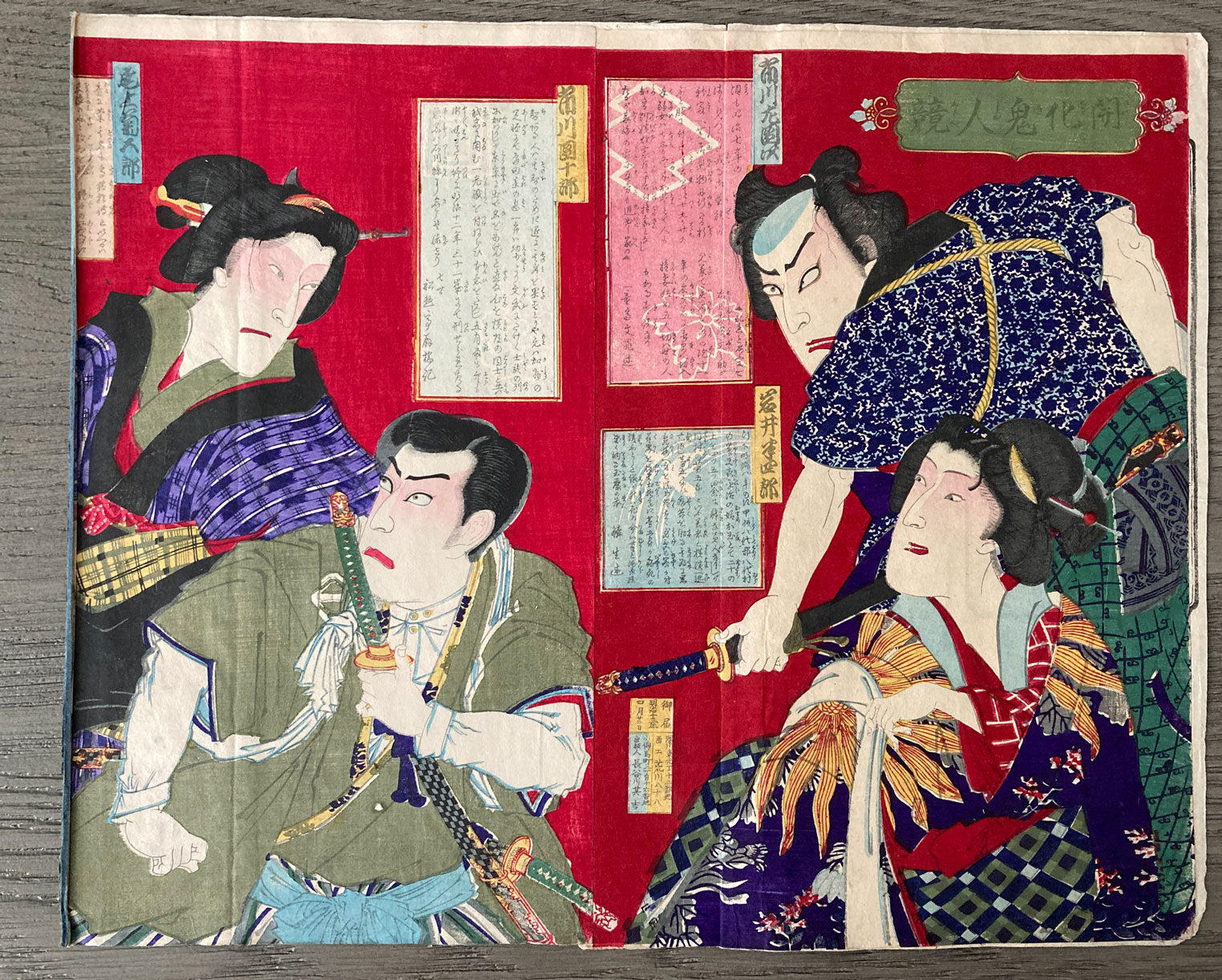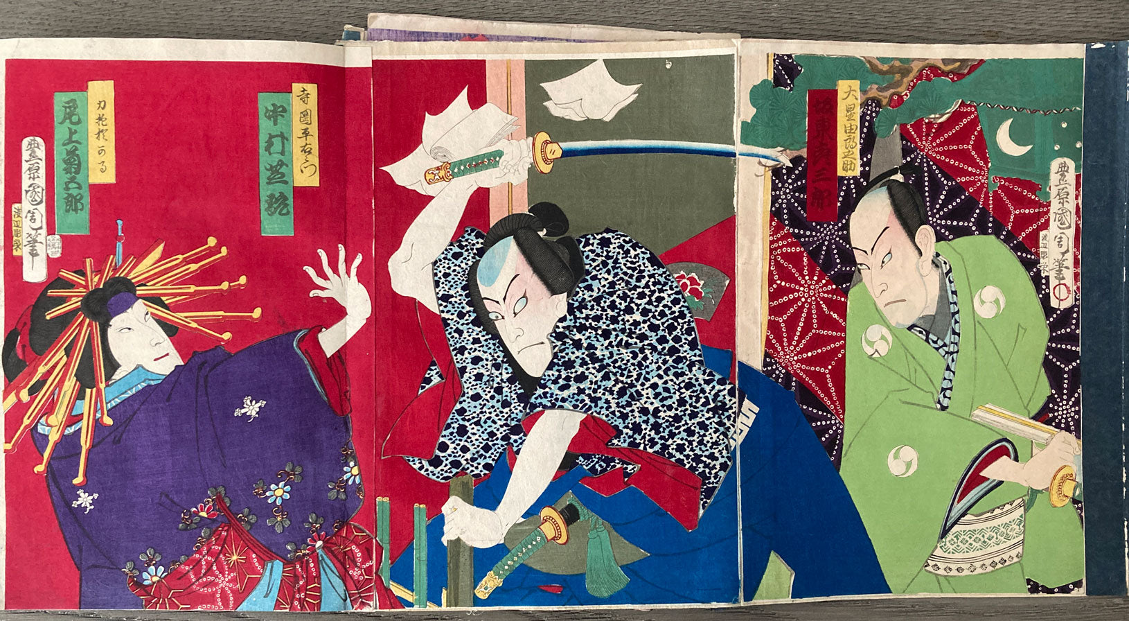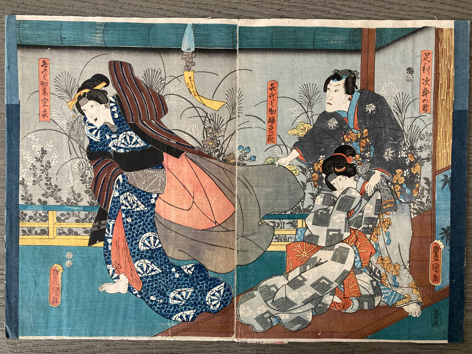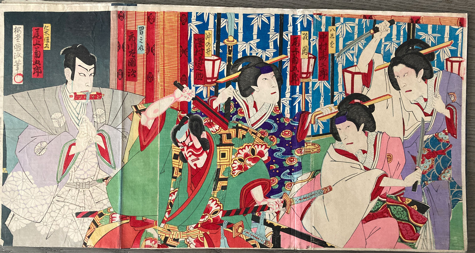 Loose pages from an original Meji Era album of prints. About 15 triptychs and diptychs. Artists include Chikanobu, Kunichika, Kunisada, and others. All pages are shown as is. You can see most of them are all glued down to the album pages, there are a couple of loose pages as well. Sorry for the condition but this is how we got it. All pages shown are included in the price.