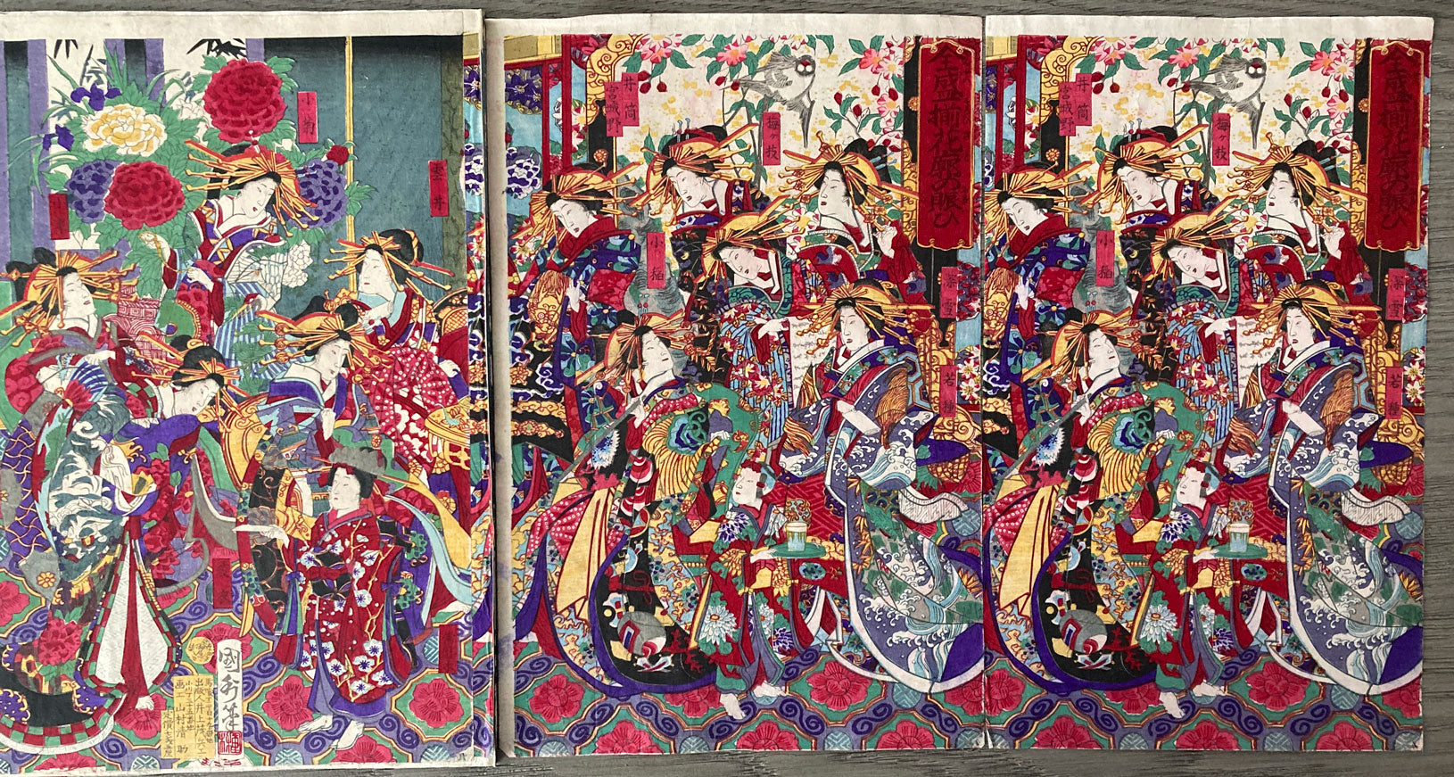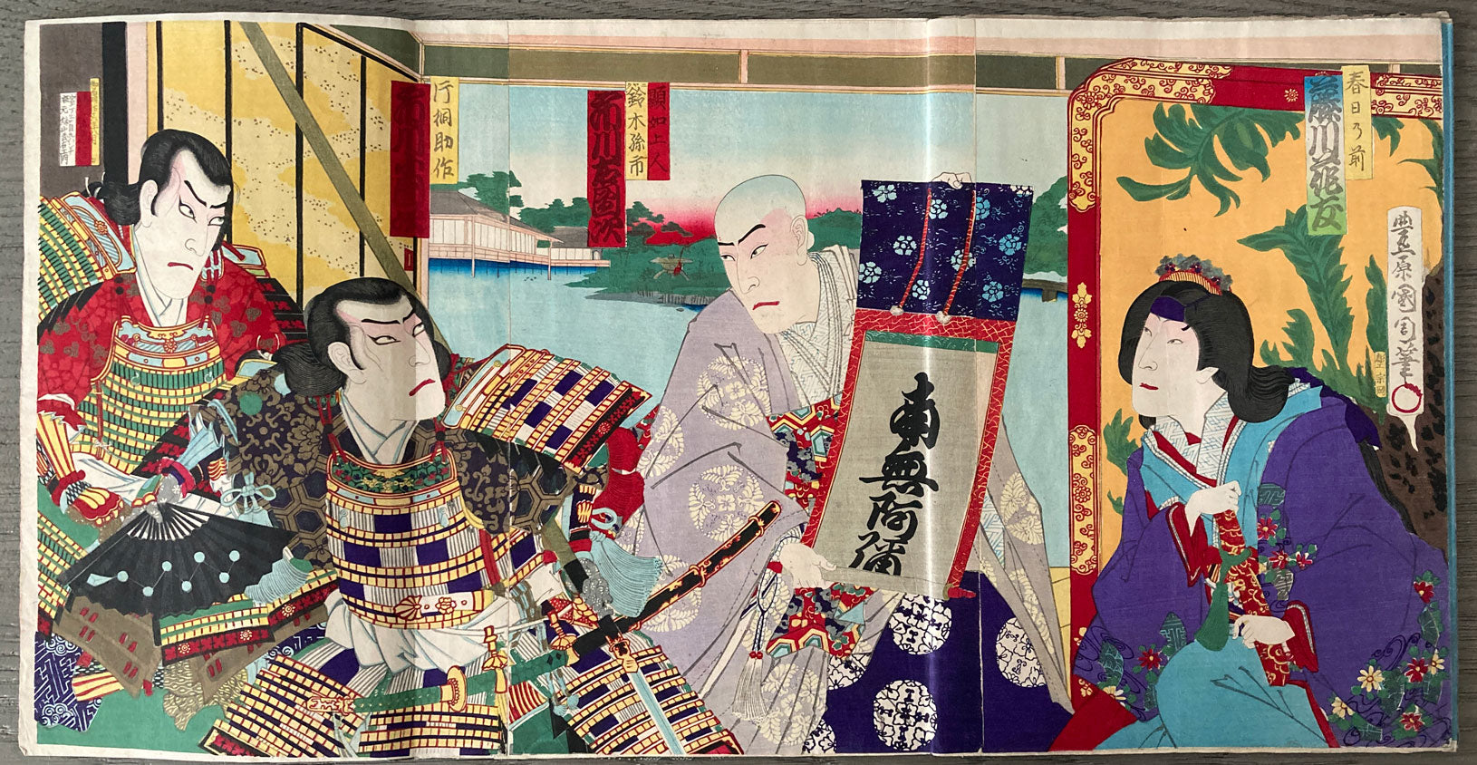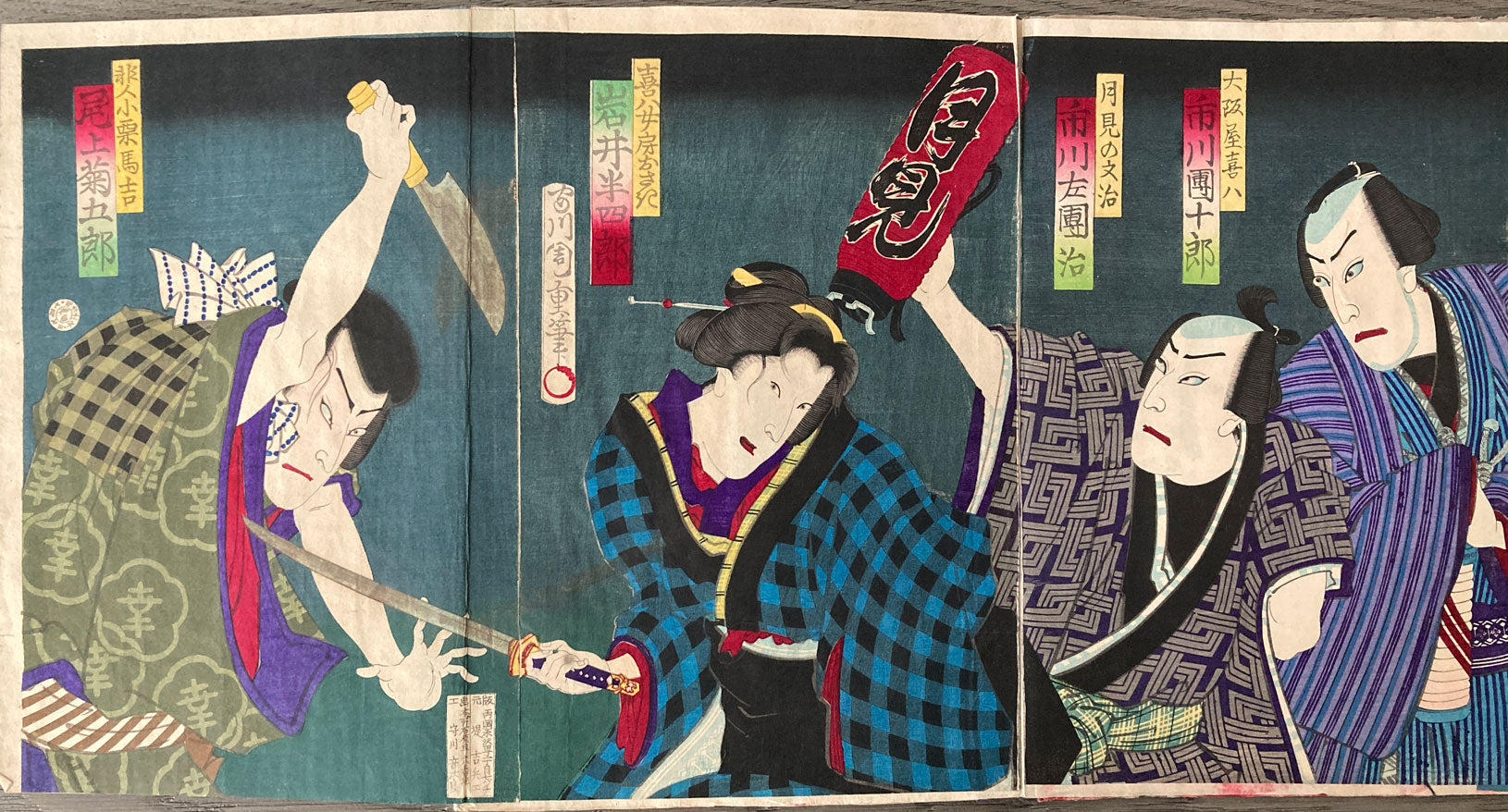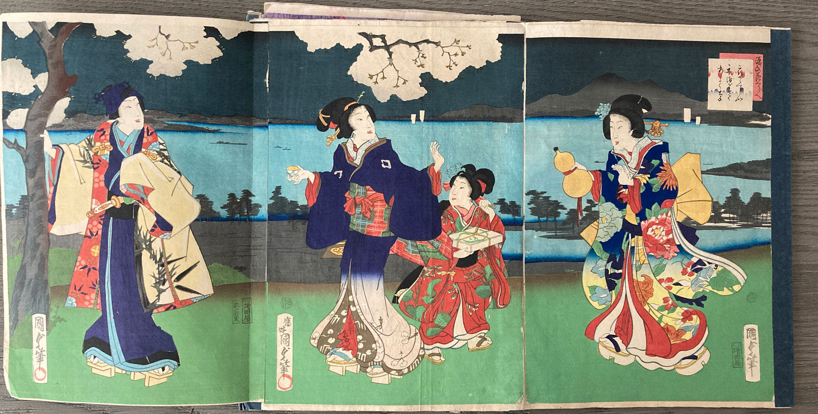 Loose pages from an original Meji Era album of prints. About 15 triptychs and diptychs. Artists include Chikanobu, Kunichika, Kunisada, and others. All pages are shown as is. You can see most of them are all glued down to the album pages, there are a couple of loose pages as well. Sorry for the condition but this is how we got it. All pages shown are included in the price.