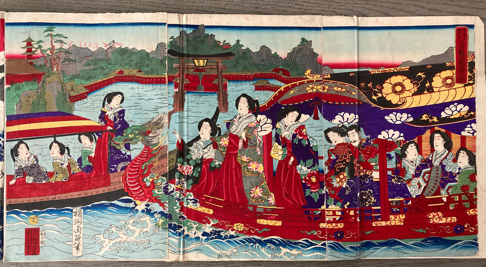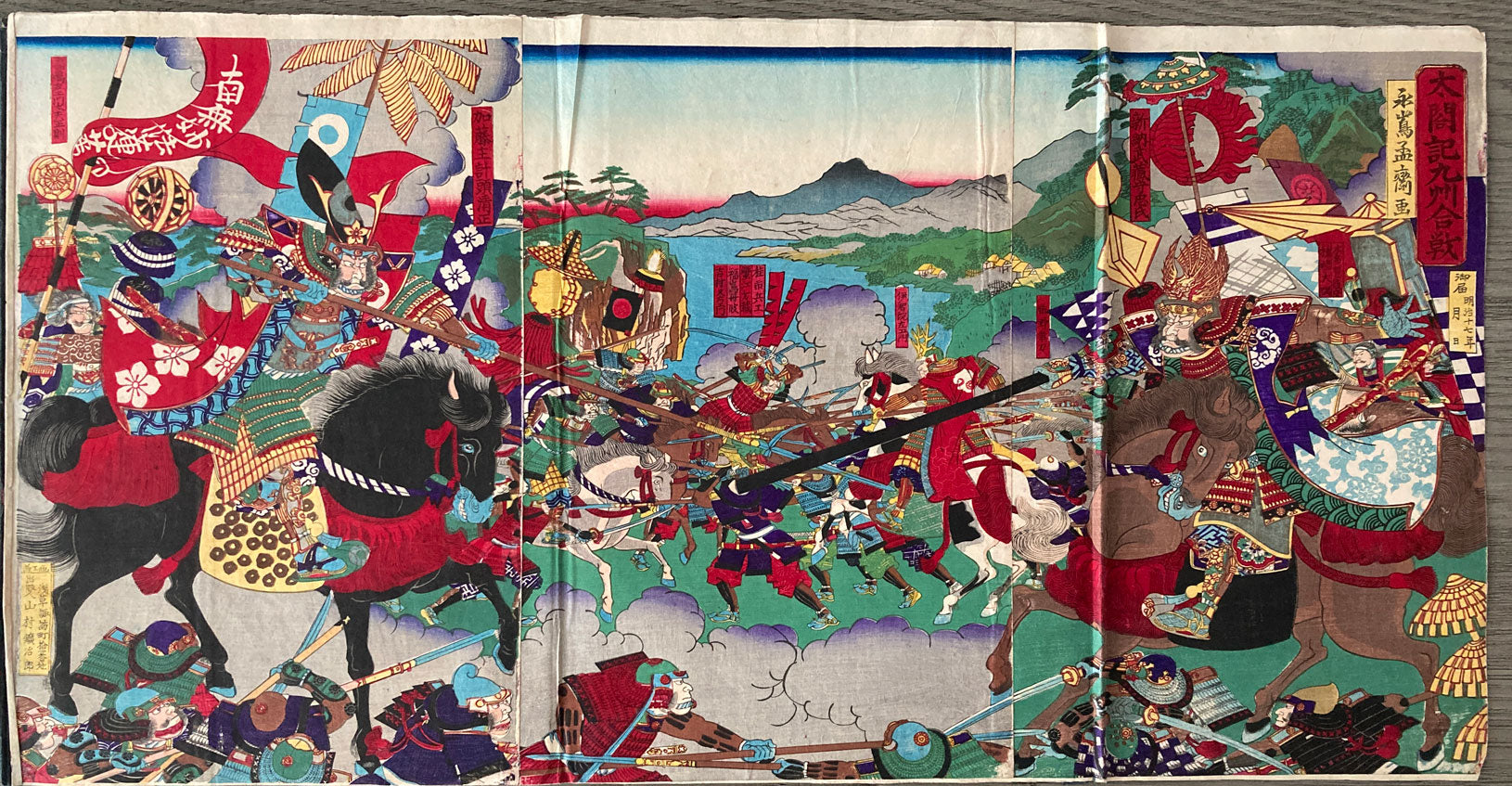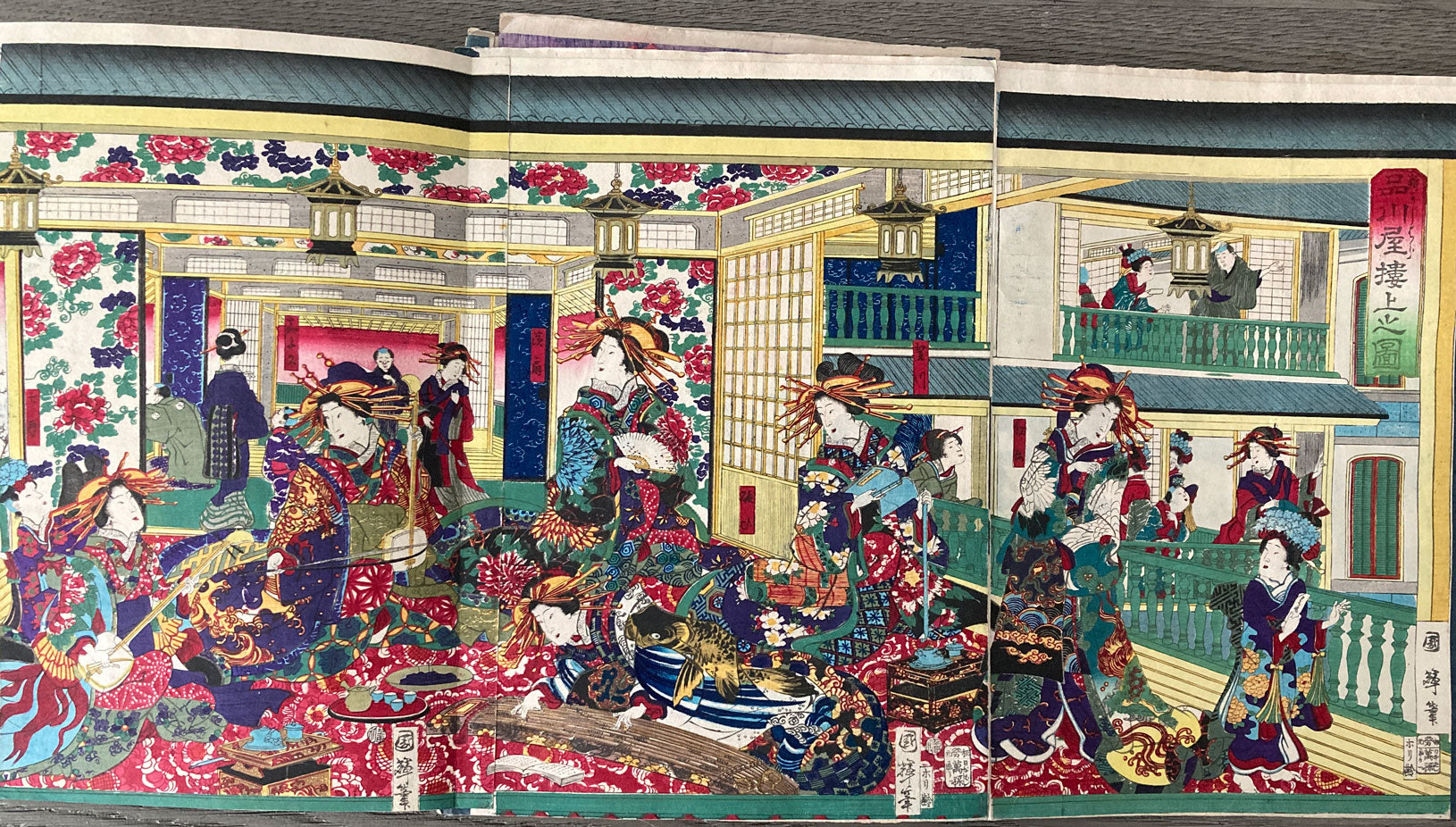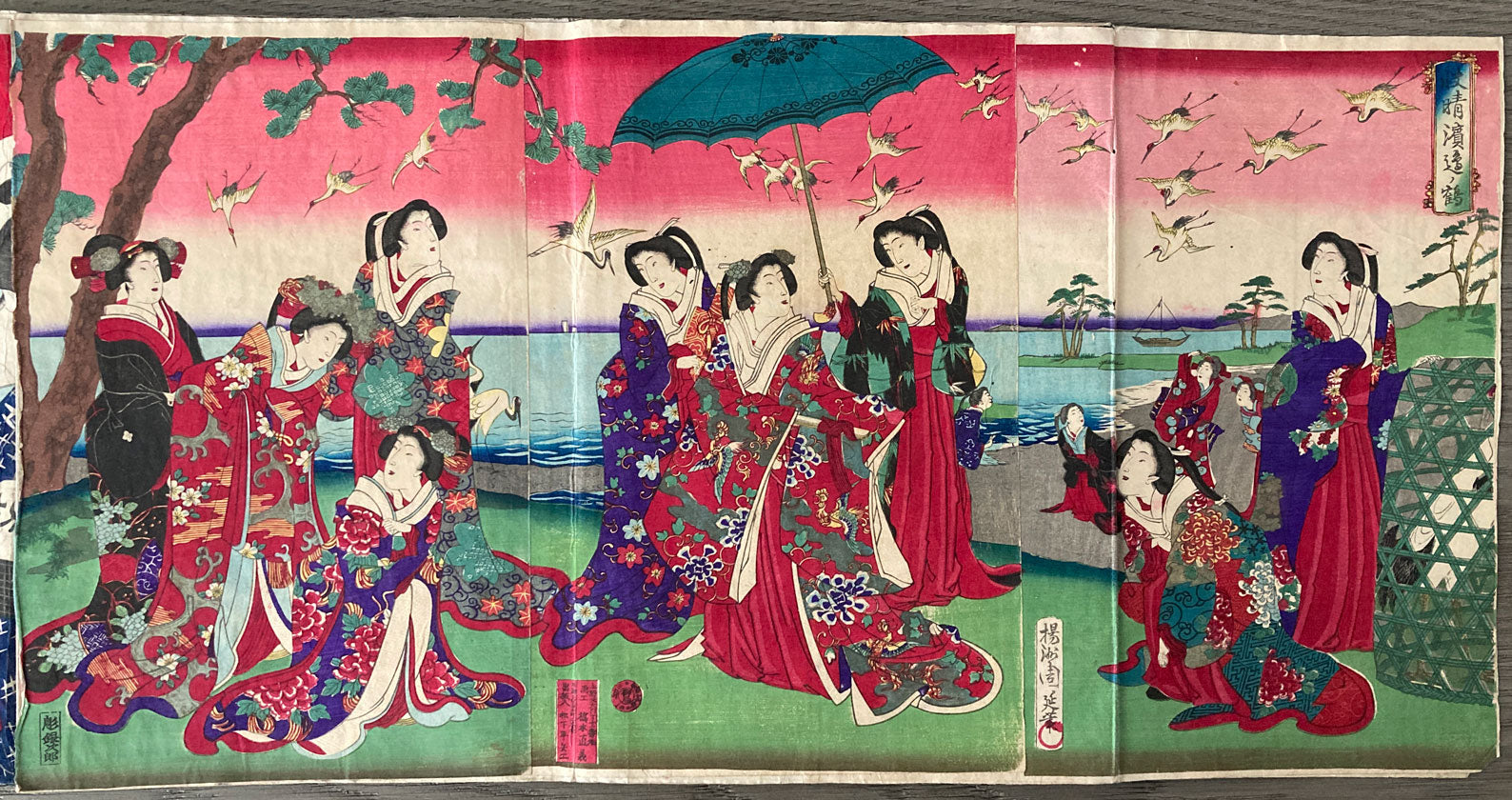 Loose pages from an original Meji Era album of prints. About 15 triptychs and diptychs. Artists include Chikanobu, Kunichika, Kunisada, and others. All pages are shown as is. You can see most of them are all glued down to the album pages, there are a couple of loose pages as well. Sorry for the condition but this is how we got it. All pages shown are included in the price.