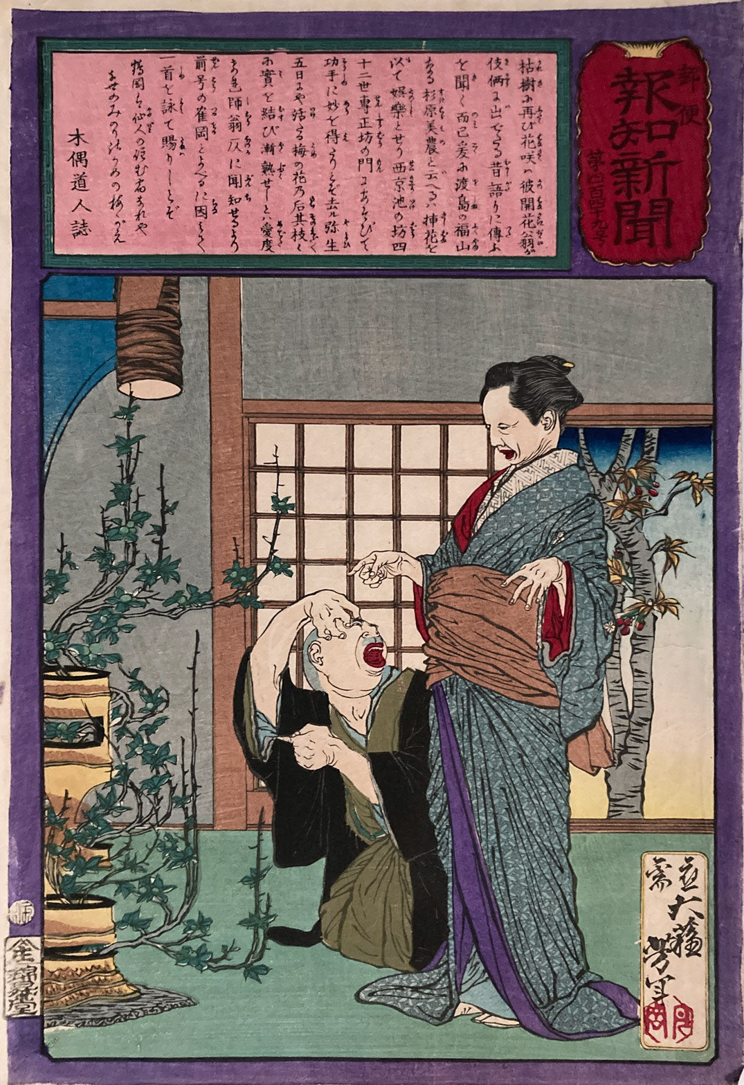 This print is a newspaper supplement print or shinbun nishiki-e. These prints published interesting, or violent stories of the day. This is from the Postal Hochi Shimbun No. 449
