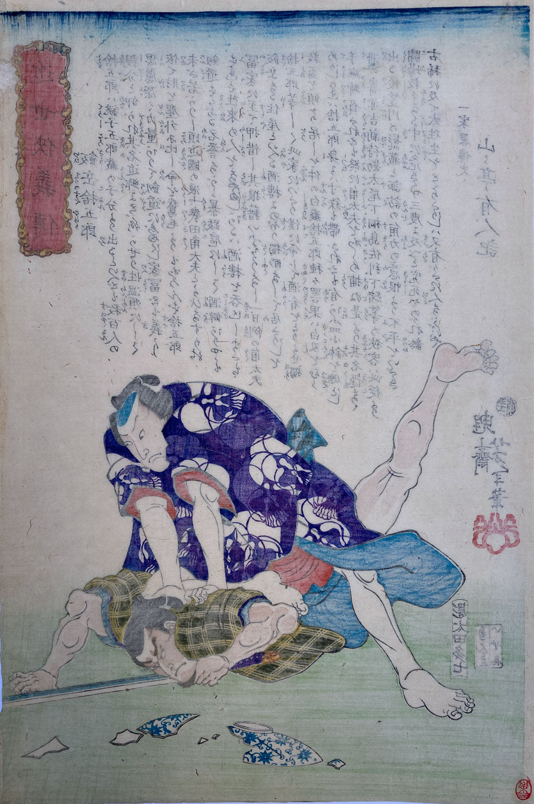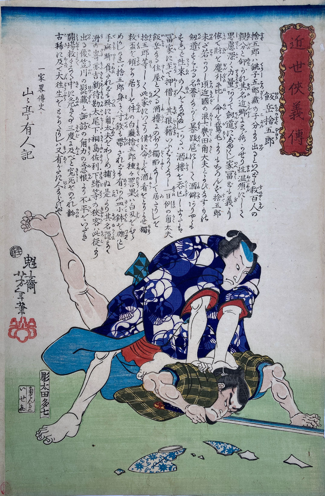Great print of the samurai Iiokano Sutegorô pinning an assailant from the series “Biographies of Modern Men” (Kinsei kyôgiden). Sutegorô is pinning an assailant, a broken bowl pictured in front of them. His kimono is decorated with abstract skulls comprised of gourd shapes. This print is in many major collections and listed in “Beauty & Violence”, series 13. Keyes number 147.6.