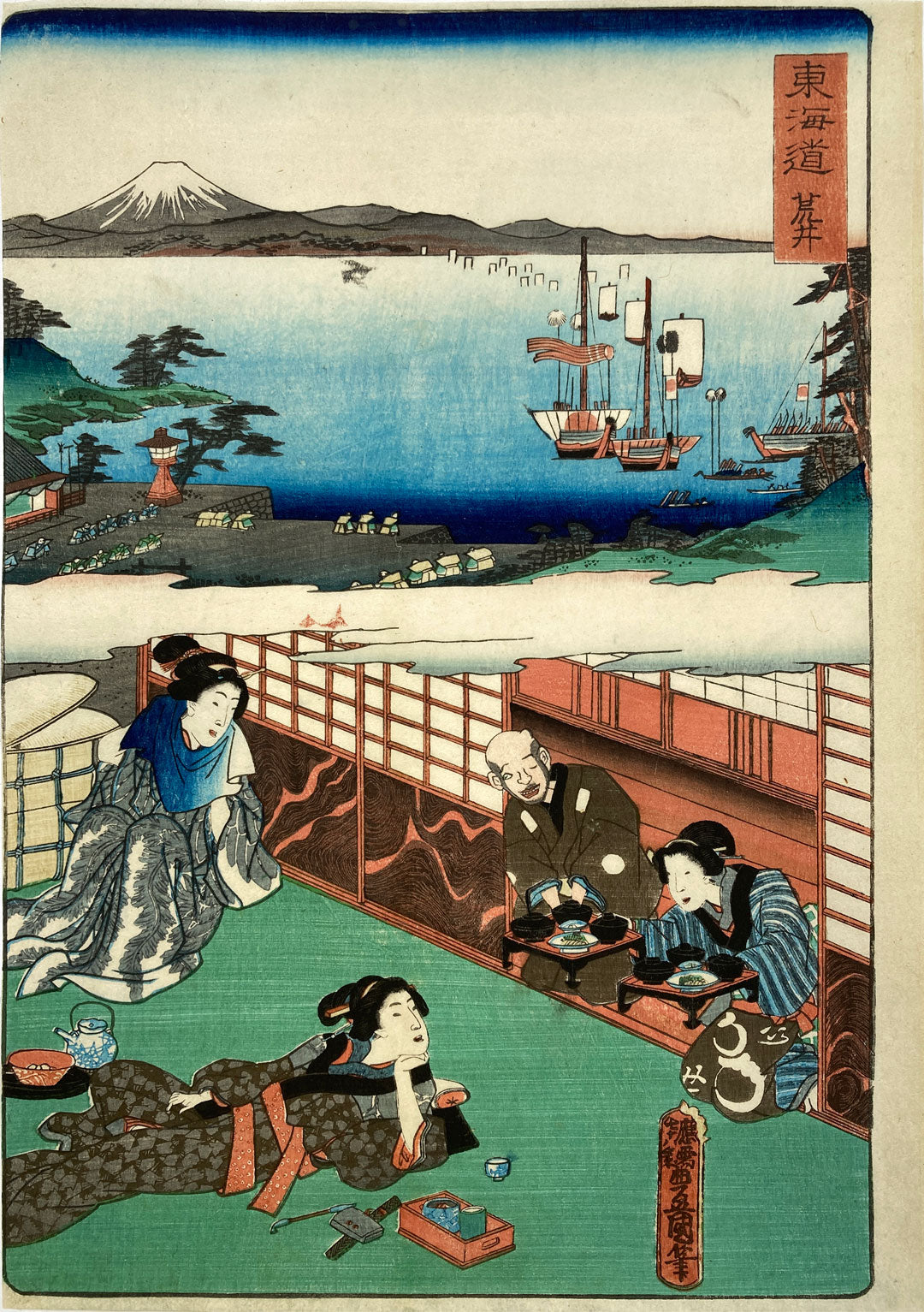 This is “Arai” (荒井) station on the Tokaido. At the top a landscape with Iemochi arriving by boat. At the bottom, two women relax at a local inn while being served by the innkeepers.