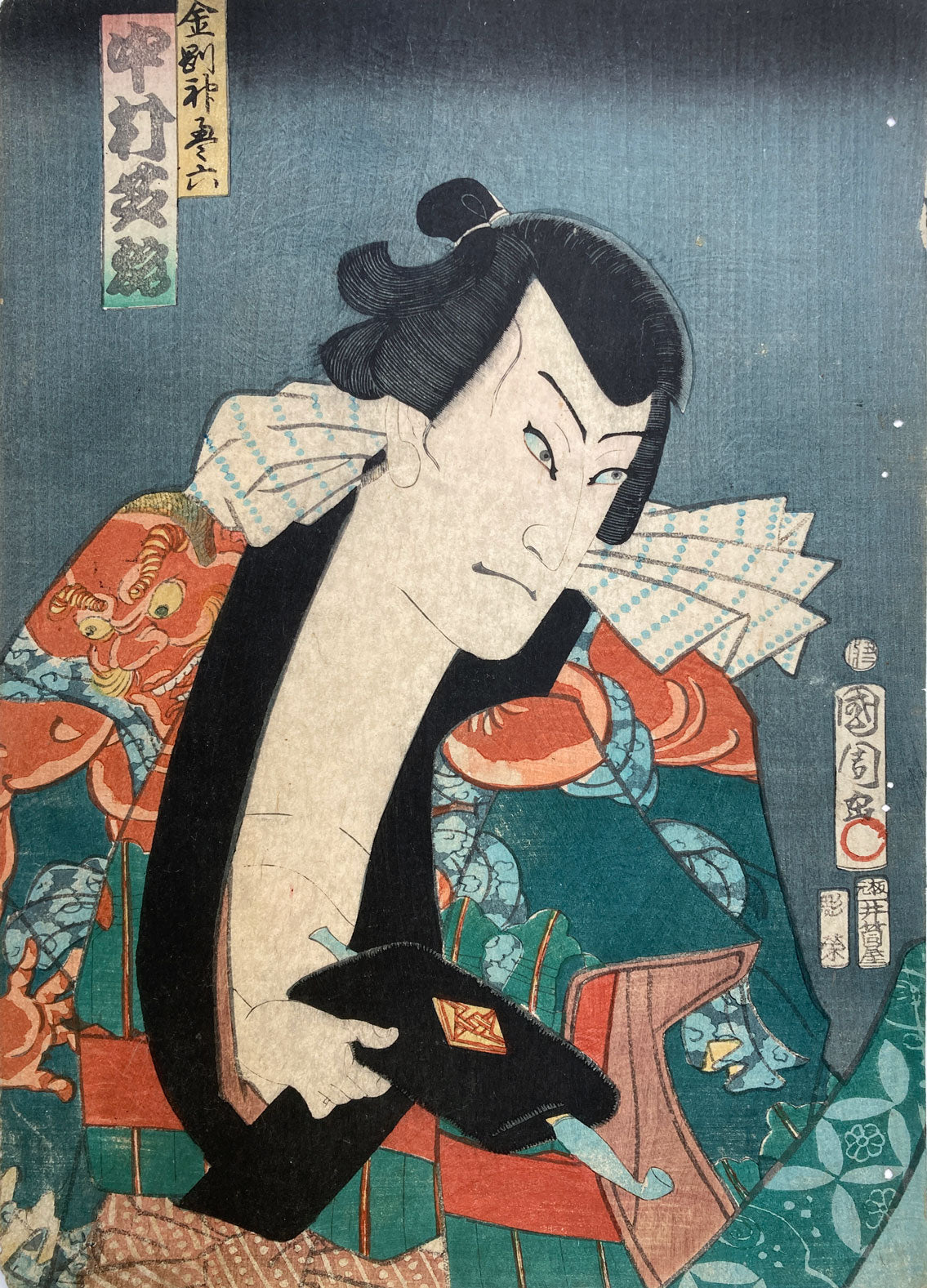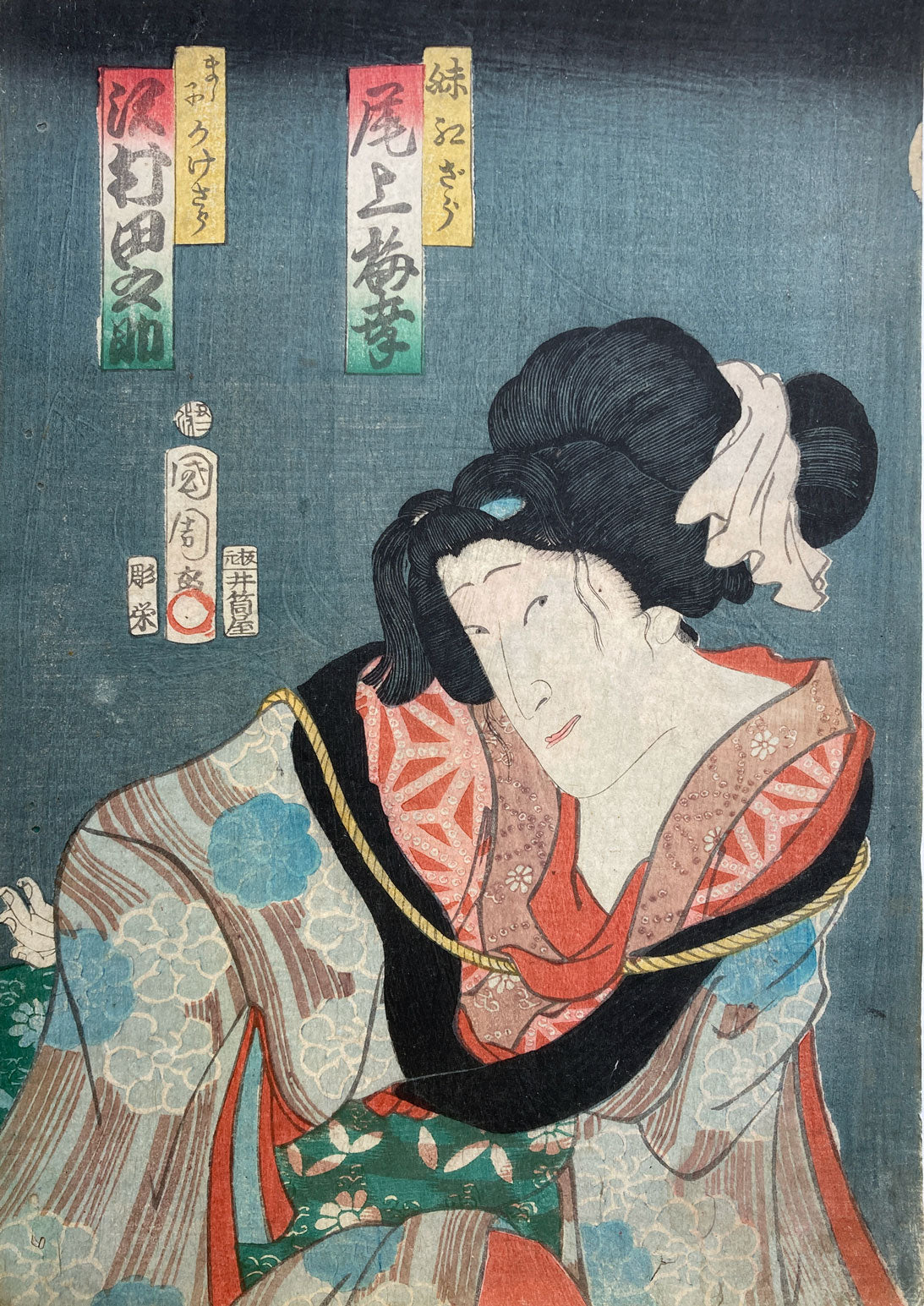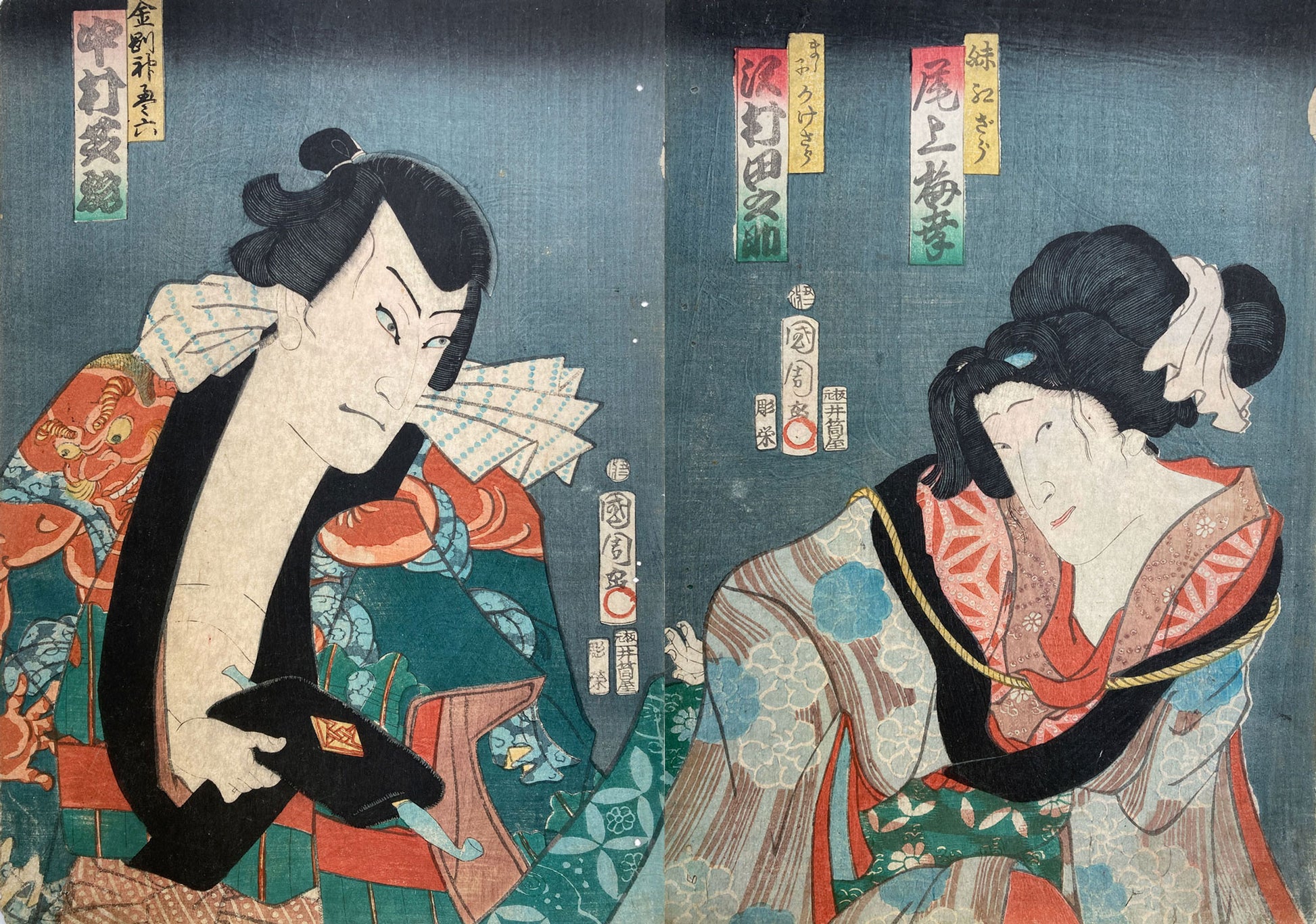 Two sheets from a triptych of a kabuki play. Actors Sawamura Tanosuke III as the Stepdaughter (Mamako) Kakezara, and Nakamura Shikan IV as Kongôjin Jôroku.