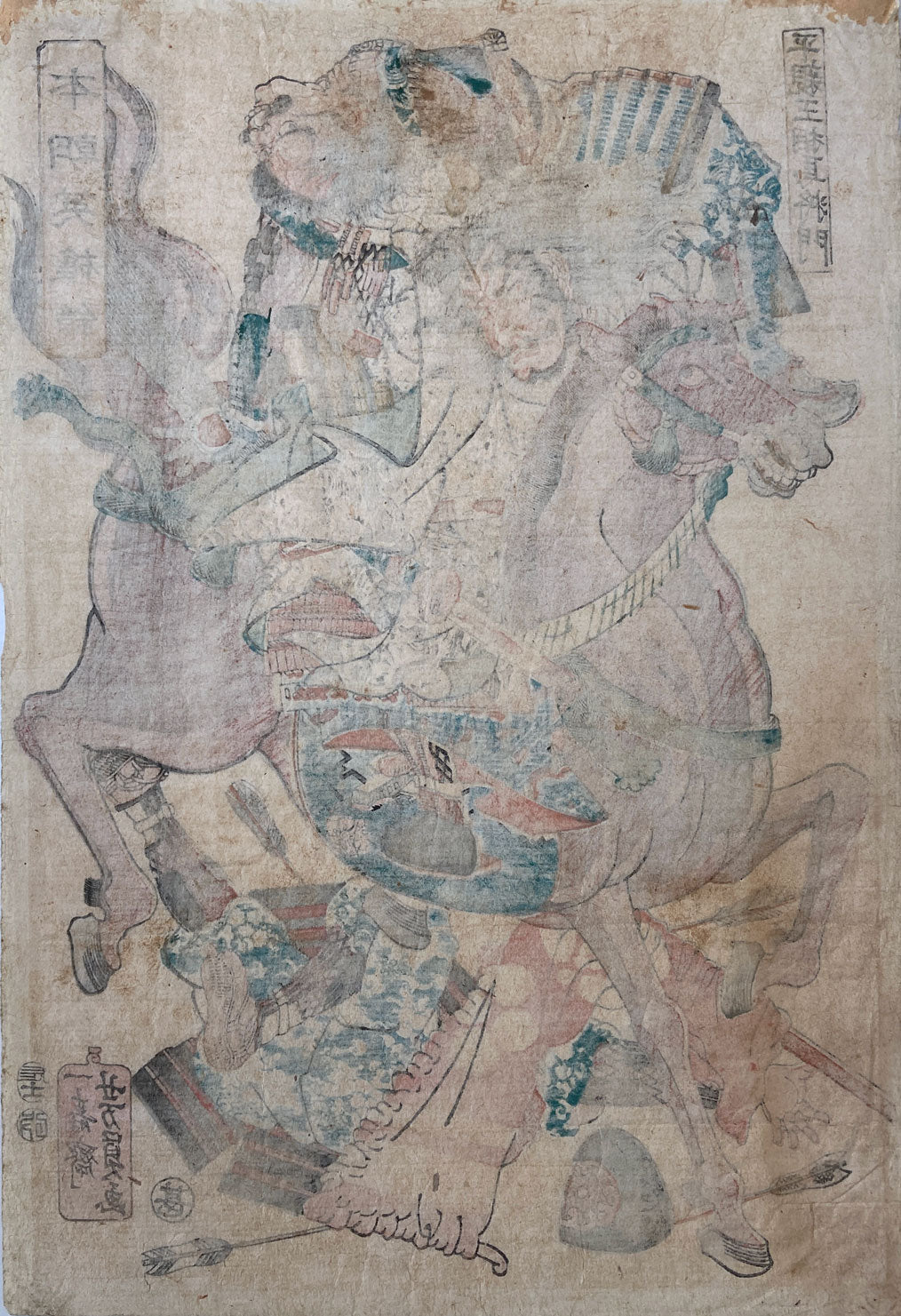 Great scene of Taira no shinno Soma Masakado from the series "Honcho eiyu kagami" by Utagawa Yoshikazu. Taira no Masakado was active during the Five Dynasties and Ten Kingdoms period in China. His birth year is unknown, but he was of a very noble family. He was the fifth-generation grandson of Emperor Kanmu. His grandfather, Prince Takami, was granted the title of Kamitsusuke and guarded Kamitsu Province for a long time to suppress the rampant bandit groups in Kanto, thus becoming a very powerful powerful family in Kanto.