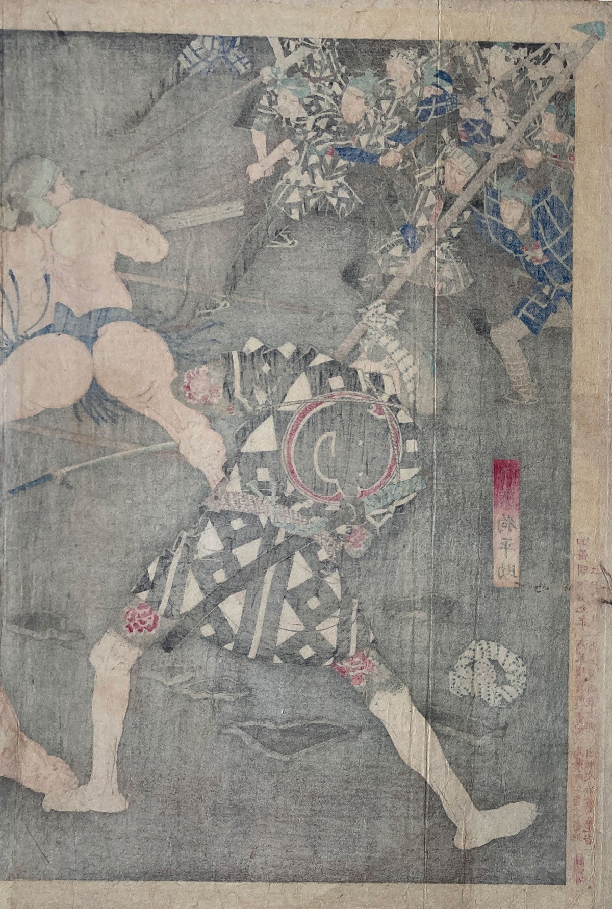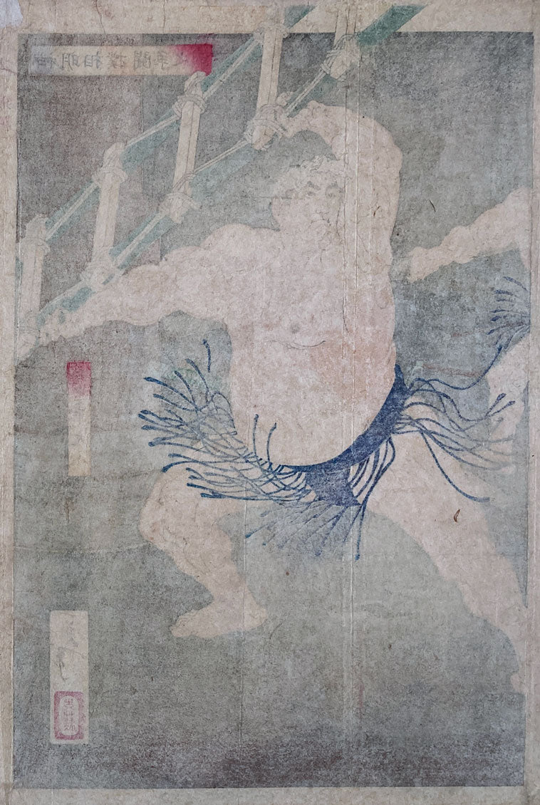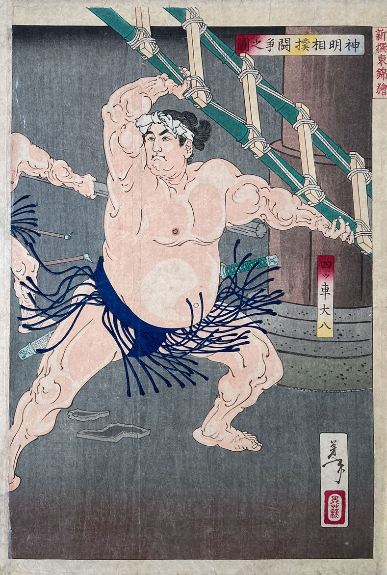 This print is Shinmei sumo toso no zu (Firemen Fight Sumo Wrestlers at the Shinmei Shrine. This is one of the most fun and popular prints in the series. It depicts a fight between the Fireman Kotengu Heisuke who was the leader, with tattoo is fighting against sumo wrestler Yotsuguruma Daihachi at Shinmei Shrine. This was an actual fight that occurred at the Shinmei Shrine in 1805.