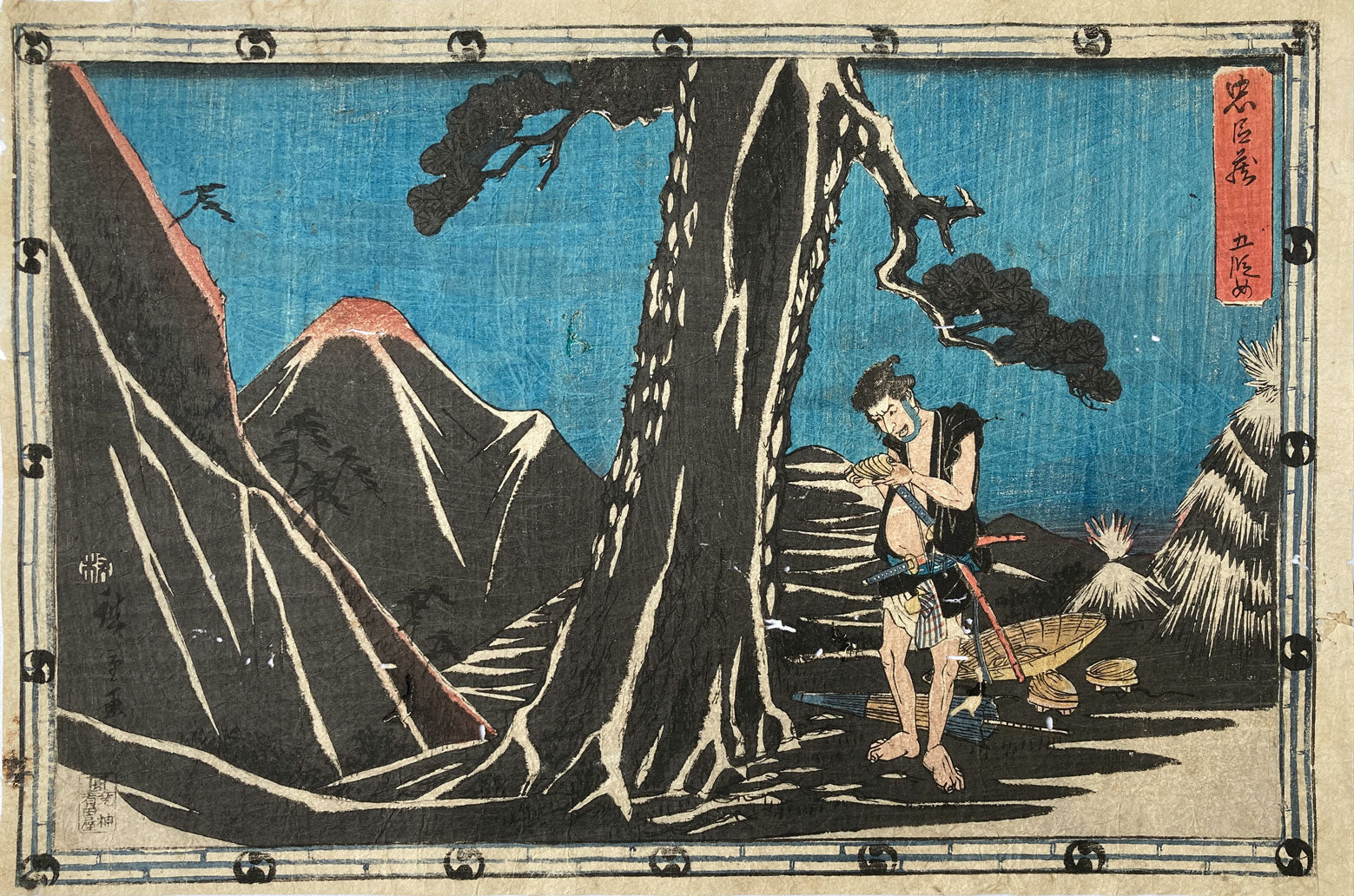 A fairly famous print from 1845 it’s from one of his Chushingura or 47 Ronin story, series. This is Act Five, where we see the robber and murderer Sada-kuro Counting Stolen Gold. Look at that brilliant blue color and Hiroshige’s mastery at character design, we really get a feel for who this person is.