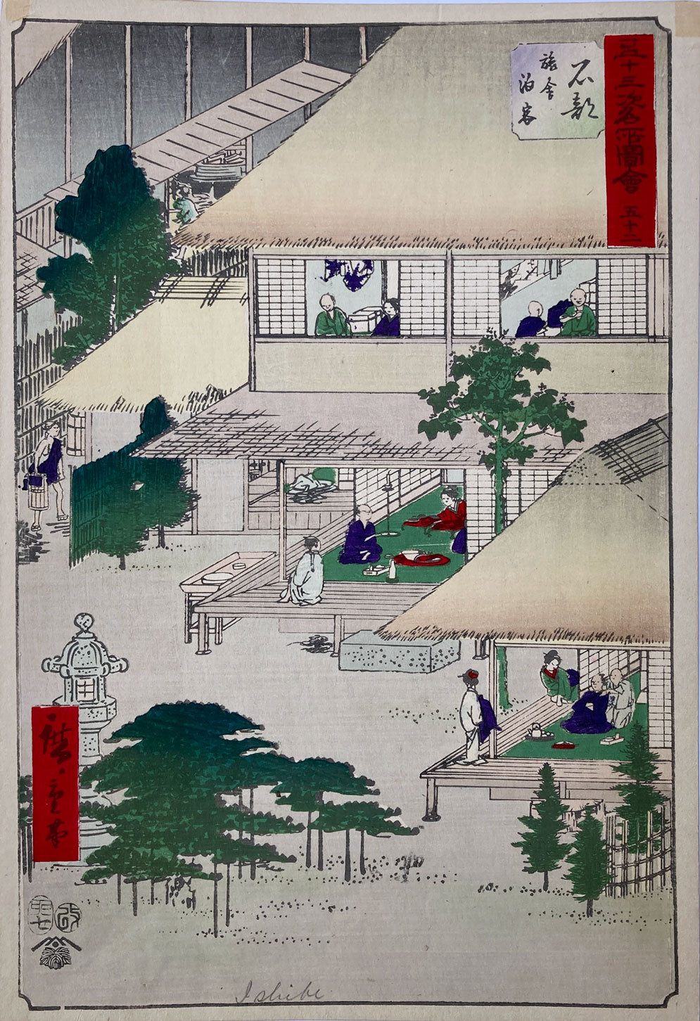 Ishibe station from "The 53 Stations of the Tokaido Road" (Upright Tokaido) was a popular rest stop for travelers on the Tokaido as they made their way from Kyoto to Edo. Here, we see travelers enjoying the evening at the many inns and restaurants in Ishibe.