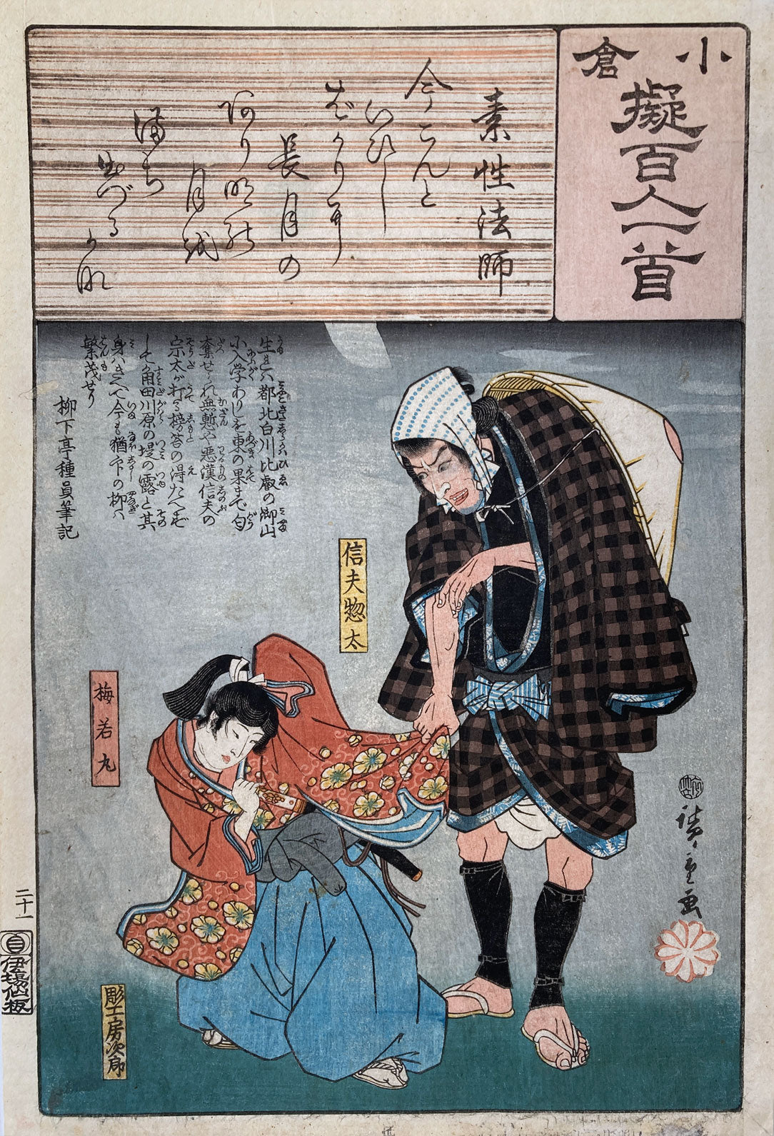 Print done by Hiroshige for this collaborative series. Shinobu Sôta and Umewakamaru, from the series Ogura Imitations of One Hundred Poems by One Hundred Poets「小倉擬百人一首 素性法師 信夫惣太 梅若丸」