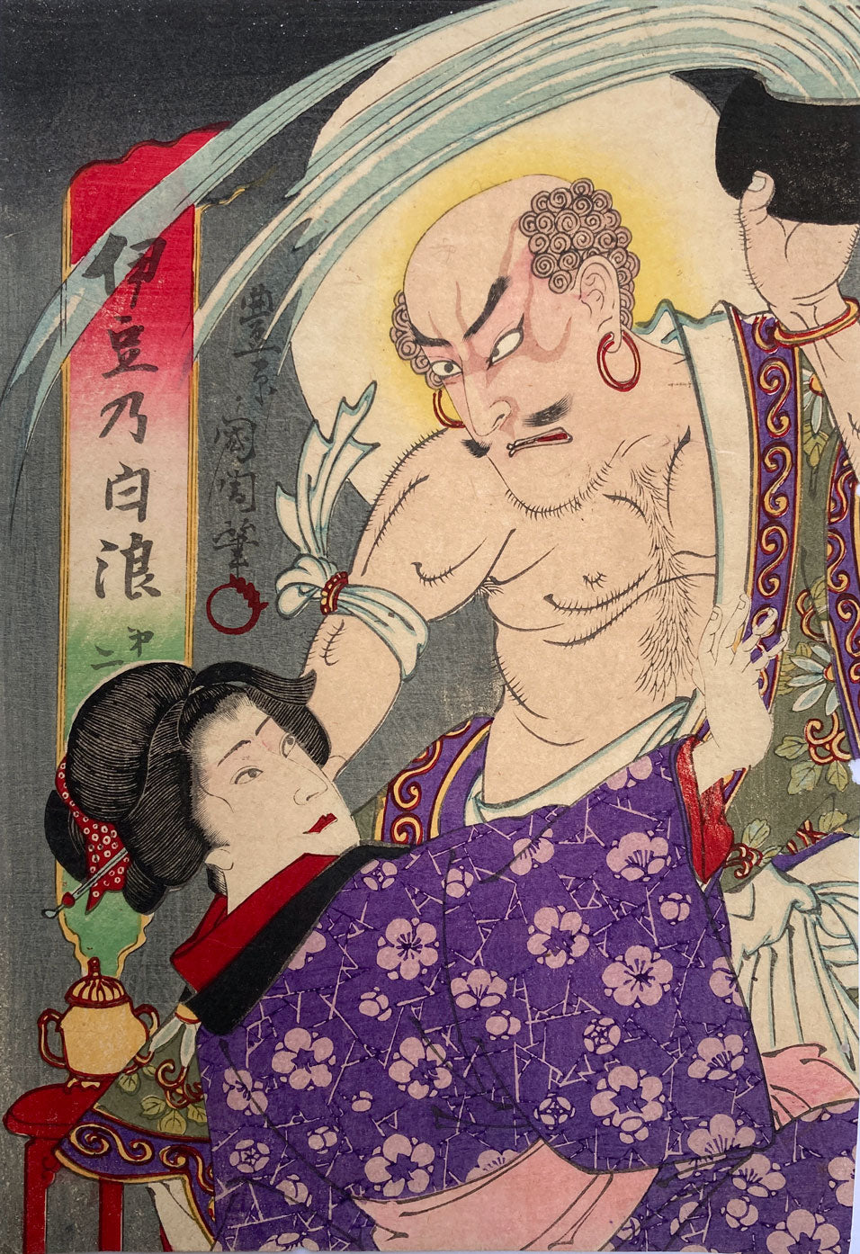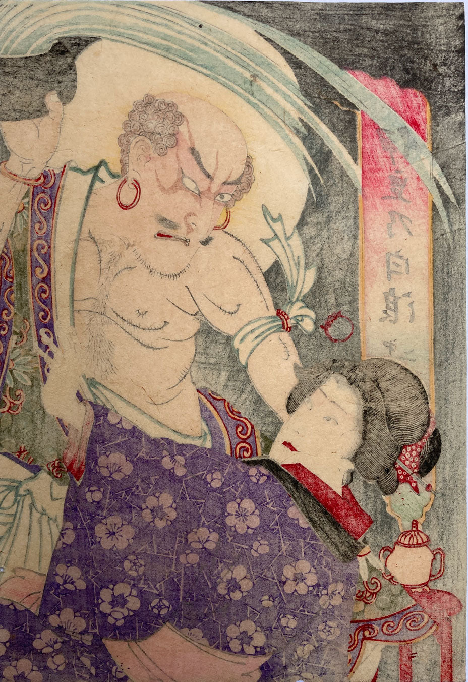 An interesting print probably from a Kabuki play. The print is titled "White Waves (Breaks) no. 2" The character is a Buddhist monk called an "Arhat" from India. He has some mystical connection to the moon, which we can see shining in the background.
