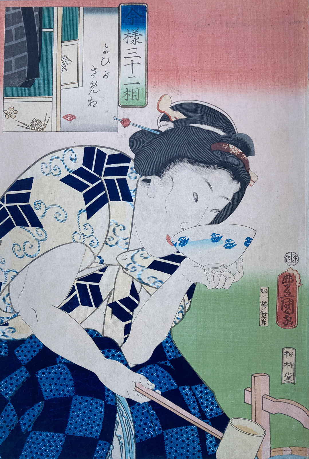 This print is titled "The Quick-to-sober Up Type" (Yoi ga sameso). A bold image from the print series Imayo sanjuni-so (Thirty-two Aspects in the Modern Style). The woman is drinking water from a rice bowl in order to sober up.