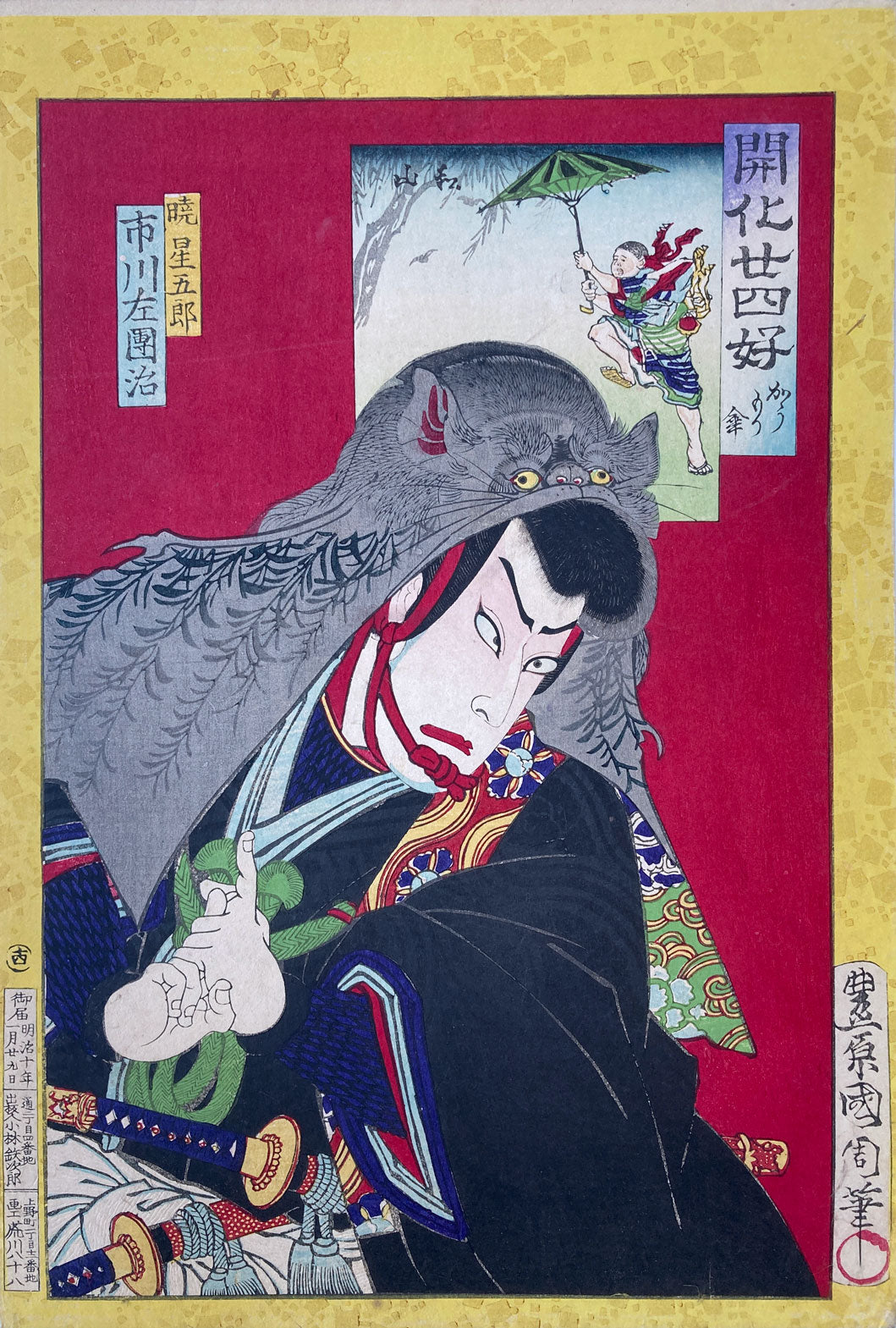 This is from the print series “Twenty-four Examples of the New Civilization” (開化廿四好), a series in which the artist pairs kabuki portraits with small scenes presenting modern inventions or modernized activities from the Meiji era - note the Western umbrella in the inset image.