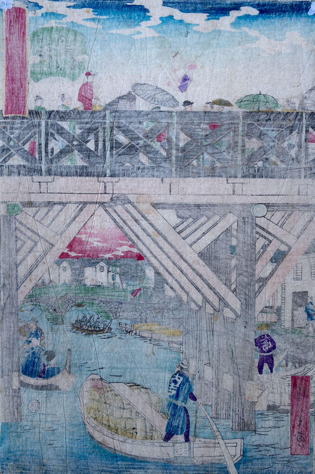 A print of Nihonbashi (bridge) from the series "Tokyo Famous Places". The bridge and the waterway below are bustling with people.