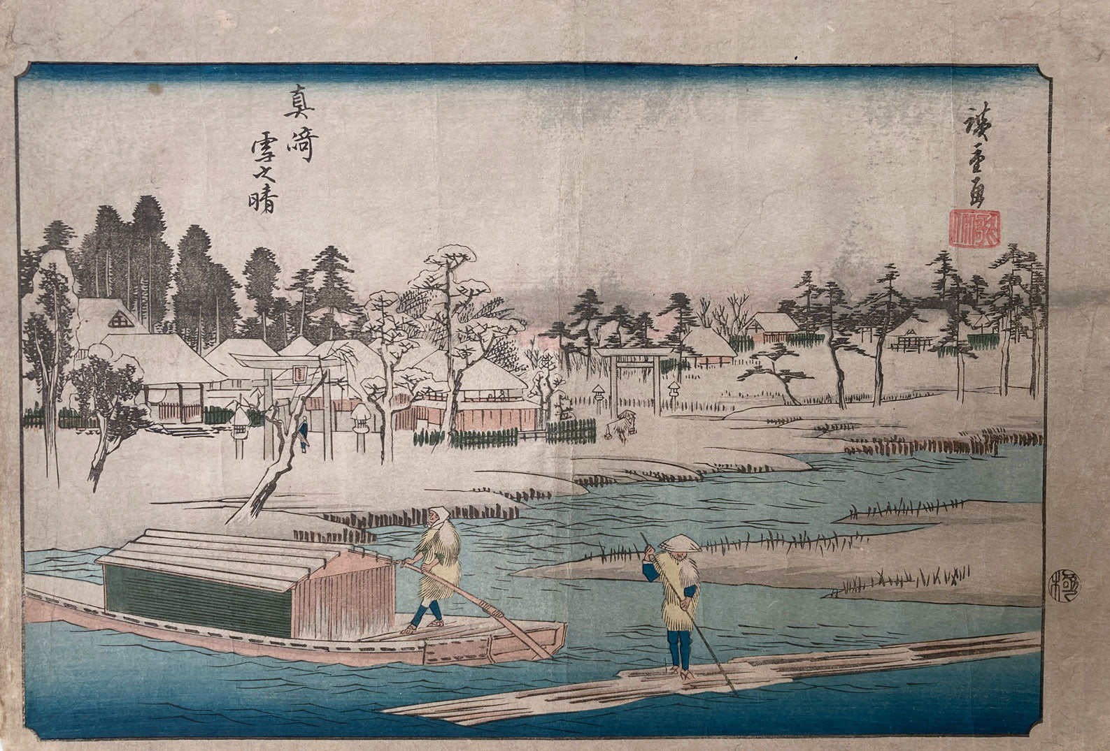 A print titled "Clear Weather After Snow at Masaki" from the series "Famous Sights of the Eastern Capital". The temple, under a deep layer of snow, is shown on the far shore. In the foreground two figures in yellow straw coats navigate the river.