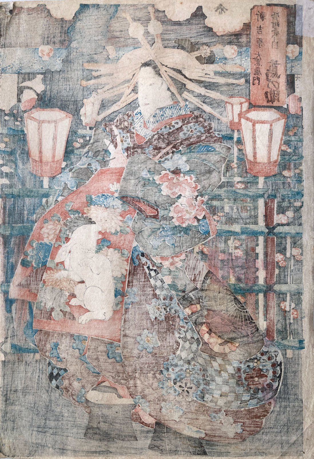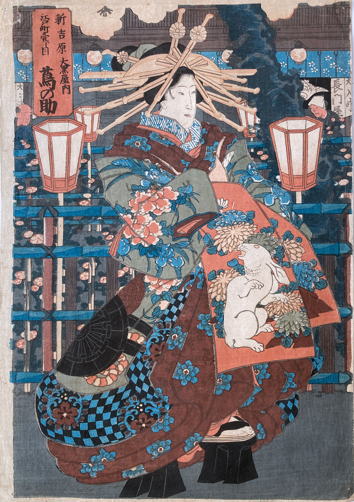 The courtesan Tsutanosuke of the Daikokuya house. In fact, she's an Oiran (花魁) one of the highest-ranking courtesans in Japanese history, who were considered to be above common prostitutes. Her ornate kimono has an interesting, bold rabbit design. This is one print in a series of seven.