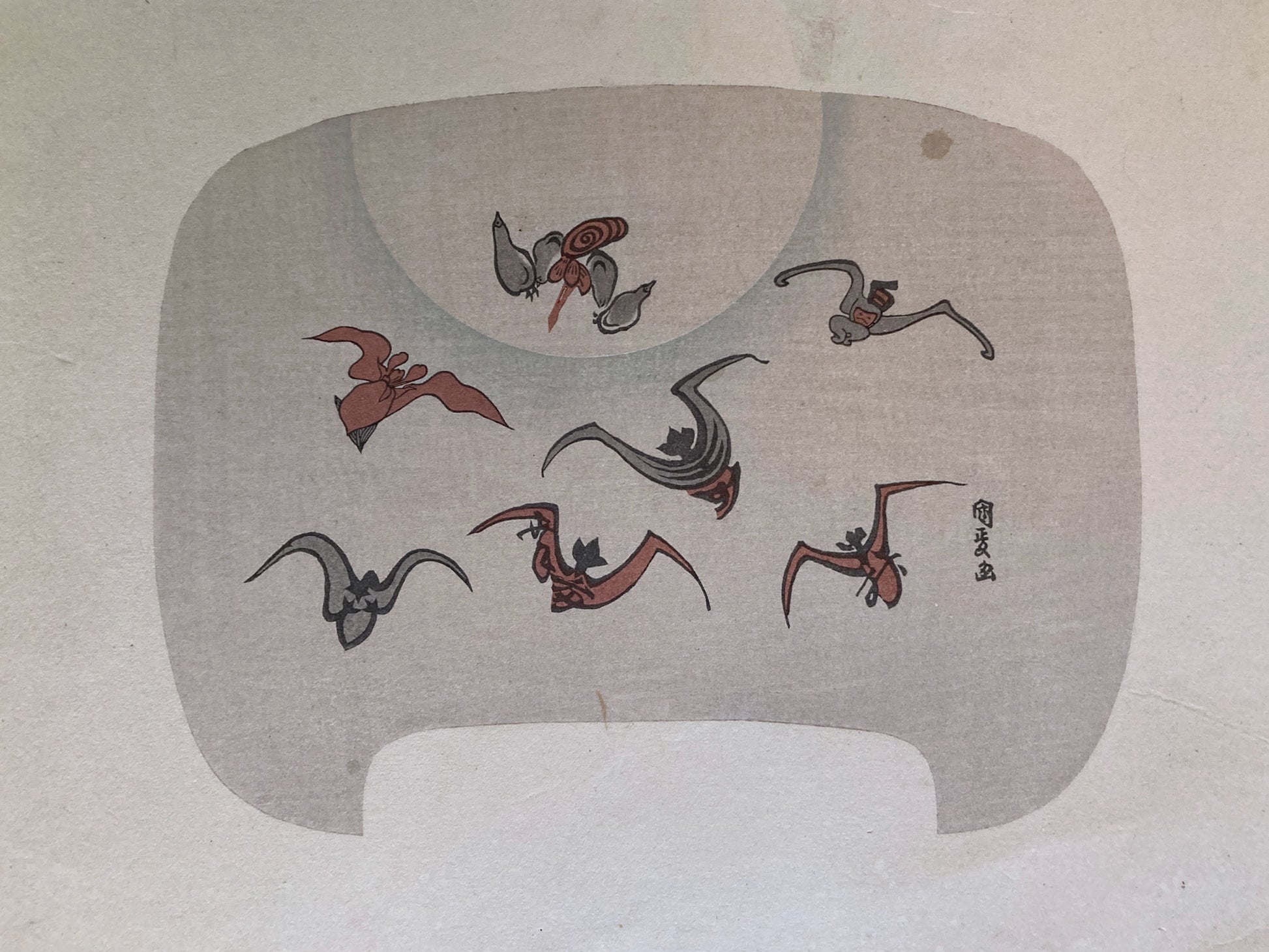 Two attractive fan prints on single sheets - from the set, "Collection of fans from the Edo period". Uchiwa-e (団扇絵) are a genre of Japanese ukiyo-e woodblock print, which appear on rigid, paddle-shaped hand fans known as uchiwa (団扇). Ovoid images matching the outline of uchiwa were printed on rectangular sheets of washi rice paper, then cut along the margins and pasted onto a skeletal bamboo frame. Great for decorative prints.