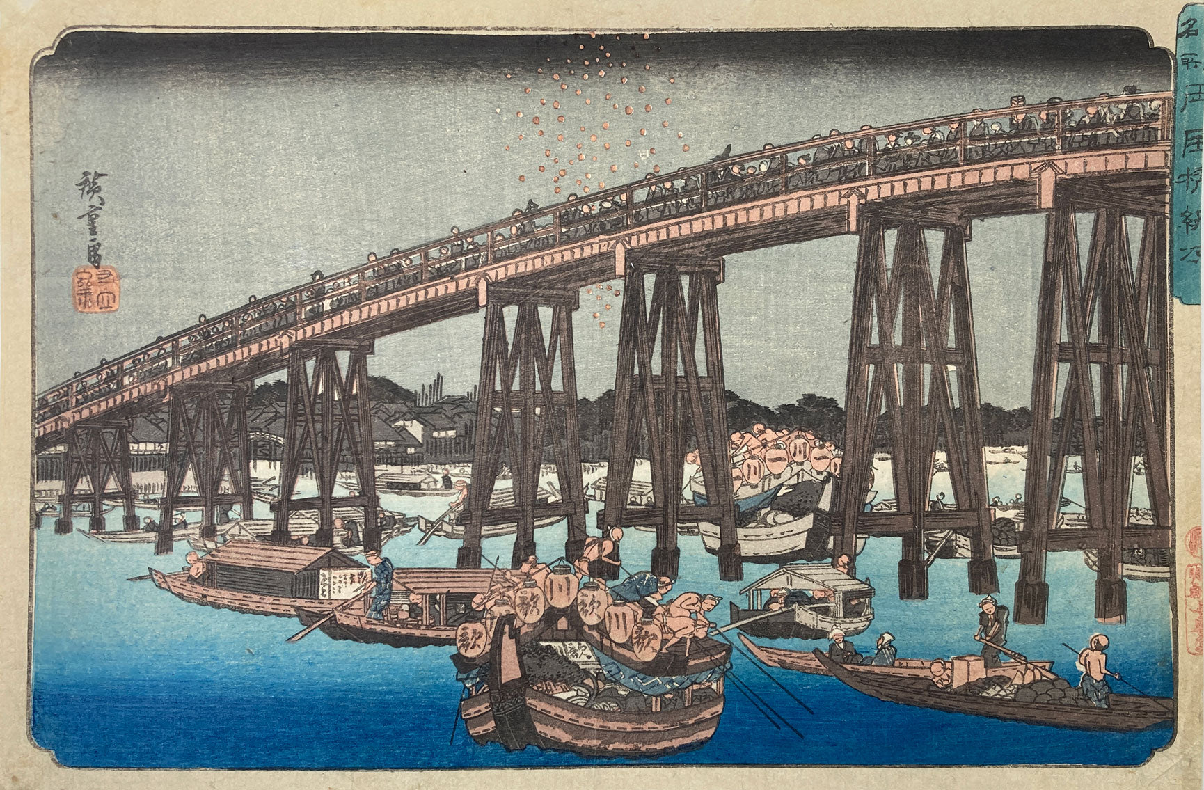 This print series followed his groundbreaking 53 Stages of the Tokaido series (Hoeido). People are enjoying the evening cool and watching the display of fireworks, in boats at Ryogoku.