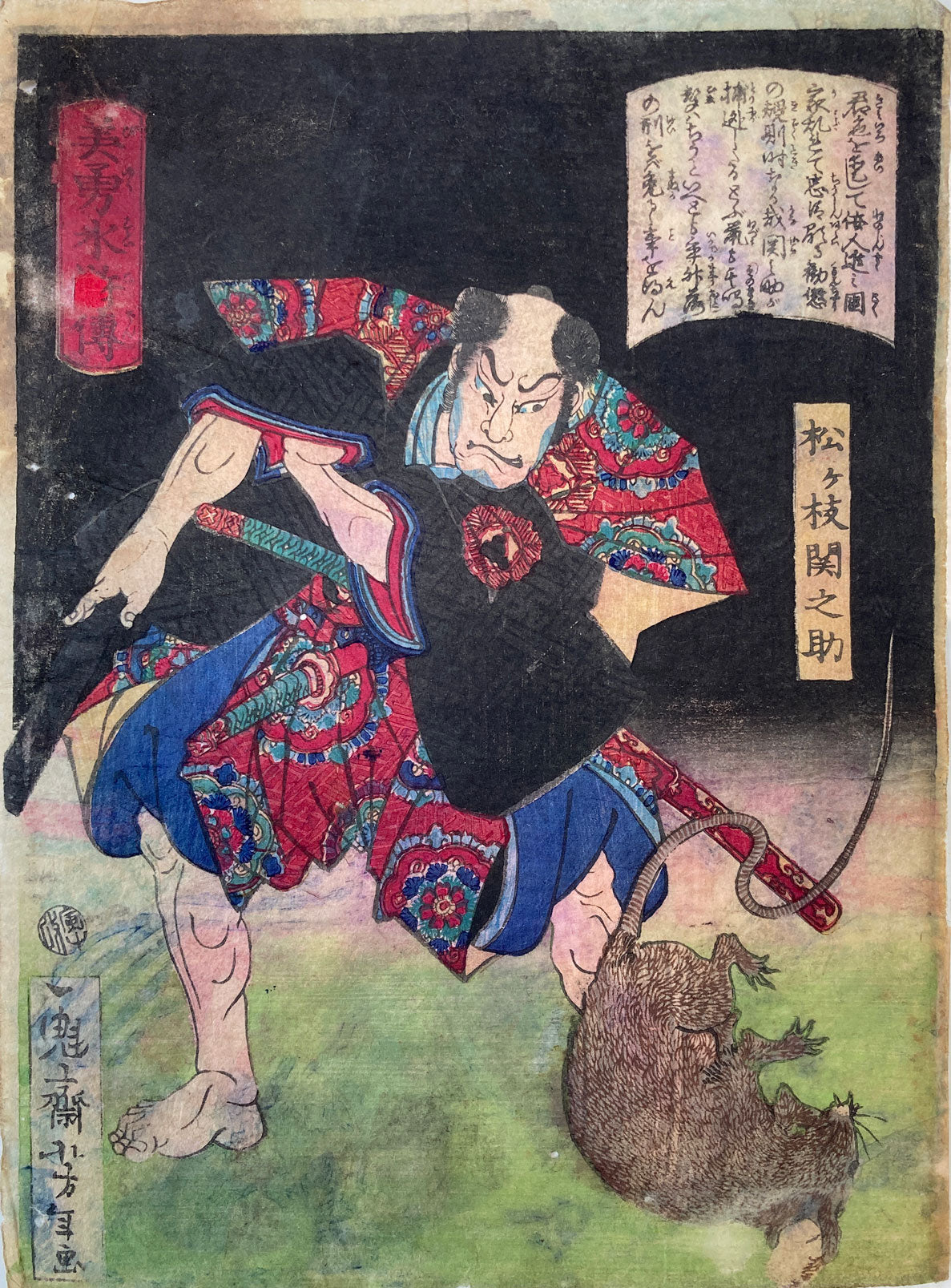 Number 16, from the series "Beauty and Valor in Tales of the Water Margin". We see Matsugae Sekinosuke glowering at a giant shapeshifting rat.