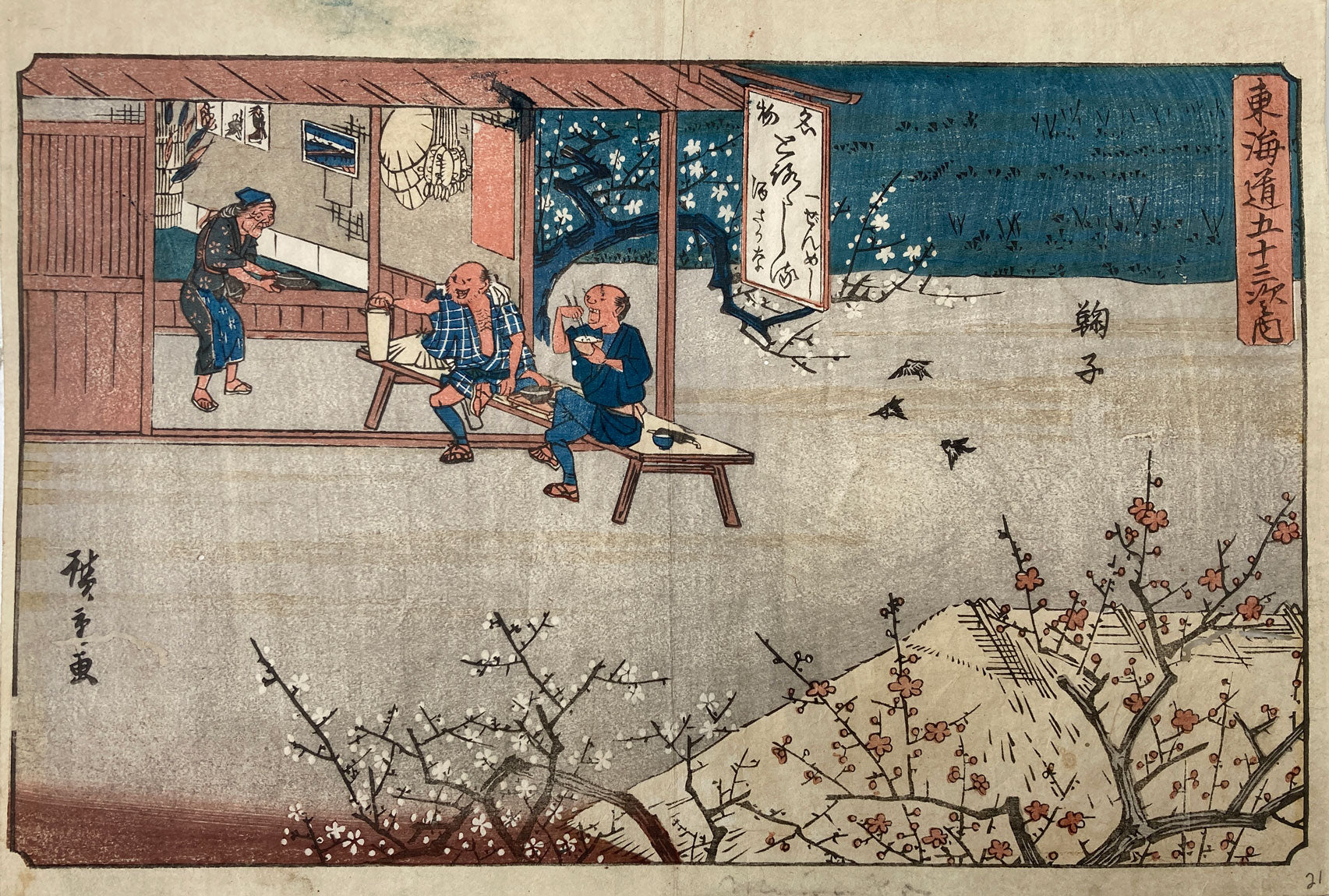 The station Mariko, from the series; Fifty-three Stations of the Tokaido Road (Gyosho Tokaido). Hiroshige's Gyosho Tokaido features lively scenes focusing on the activities of common travelers on the Tokaido. These charming designs are attractively colored and feature engaging caricatures of the people of the day.