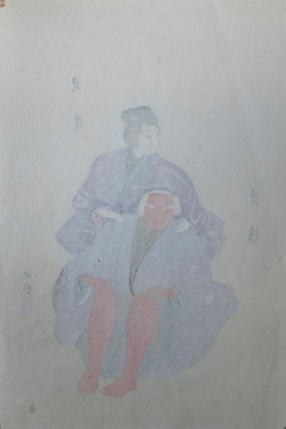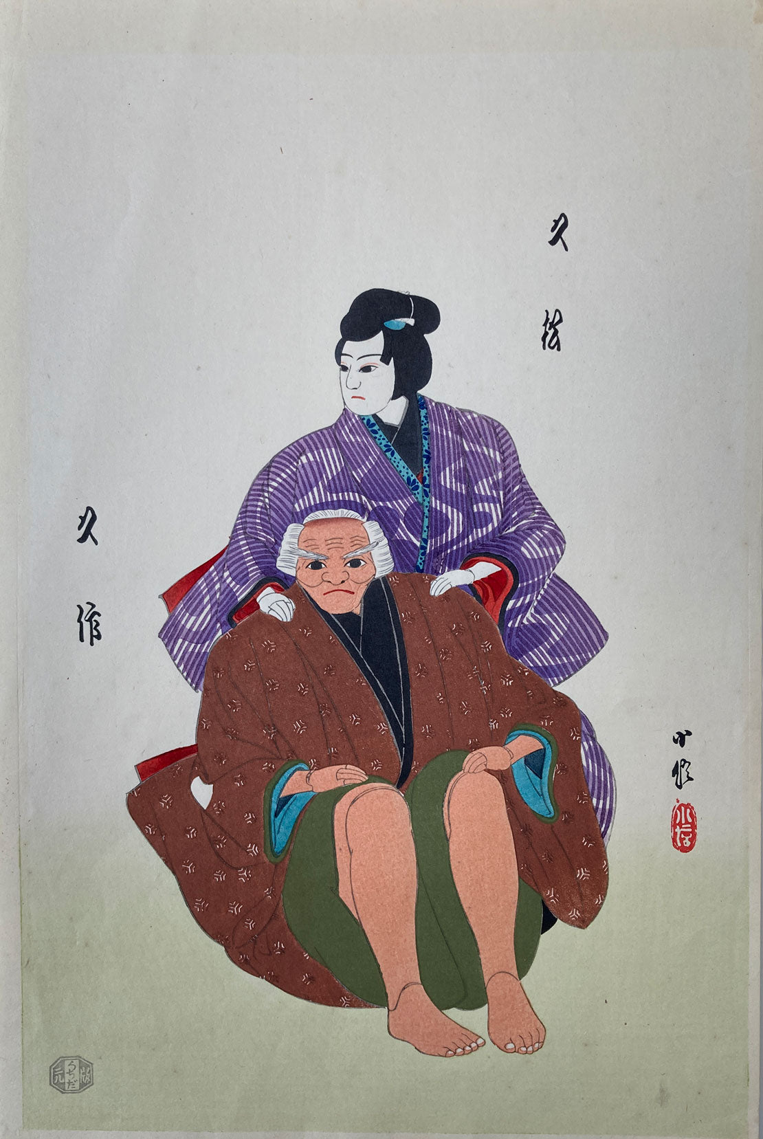 Hisamatsu and Kyūsaku in "Shinpan Utazaimon" from the Illustrated Collection of Famous Japanese Puppets of the Osaka Bunrakuza. Picturing the puppets Hisamatsu 久松 and his elderly foster father Kyūsaku 久作 in the play Shinpan Utazaimon (The New Scandalous Ballad of Osome and Hisamatsu) written by Chikamatsu Hanji (1725-1783) and first staged in 1780. In this famous scene, Hisamatsu is rubbing Kyūsaku's shoulders just before they decide to commit suicide if they cannot marry.