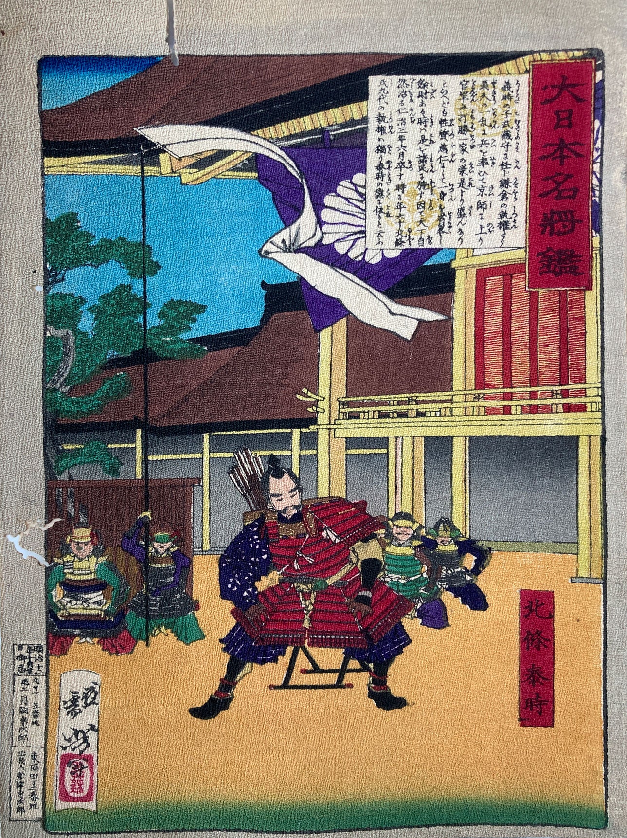 Hōjō Yasutoki on the Grounds of the Imperial Palace, from the series 'Mirror of Famous Generals of Japan (Dai nippon meisho kagami)'. The series features images of warriors from throughout Japan's history with accompanying text.