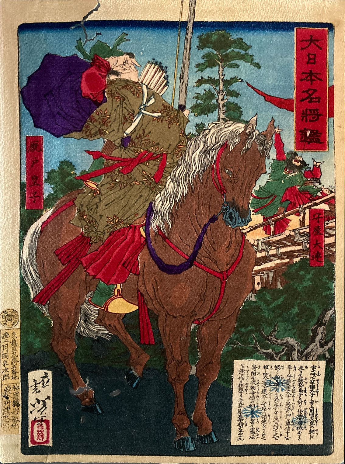 Prince Shotoku killing Moriya no Omuraji, from the series 'Mirror of Famous Generals of Japan (Dai nippon meisho kagami)'. Prince Shotoku is revered as the first patron of Buddhism in Japan. The series features images of warriors from throughout Japan's history with accompanying text.