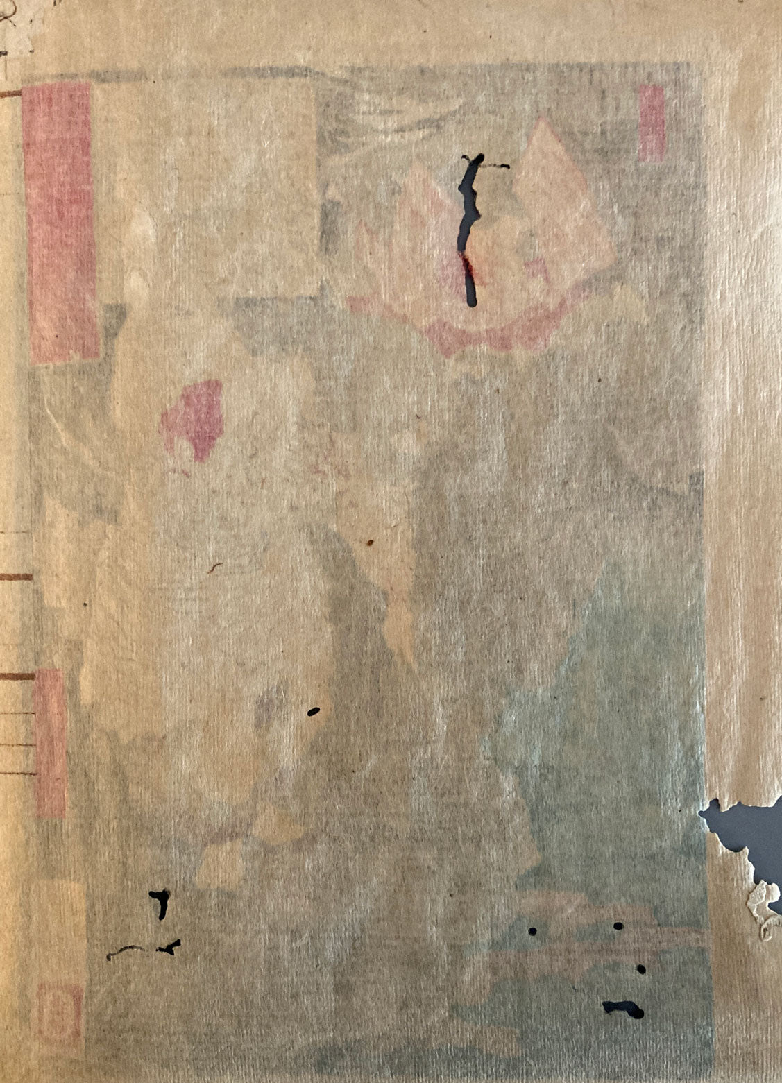 A rare Yoshitoshi crepe paper print, Chirimen gami-e (縮緬紙), also known as “crepon”. Van Gogh had 17 crepe prints in his ukiyo-e collection. This Meji-era technique involves using a type of crepe paper, to create beautiful textured prints. Woodblock prints were made at actual Oban size on the crepe paper, and then through an involved process of compression and dampening, the print shrinks in size, greatly concentrating the details and colors. These prints are all backed - which is good, since the paper material by itself is similar to a thin fabric and easily warped.