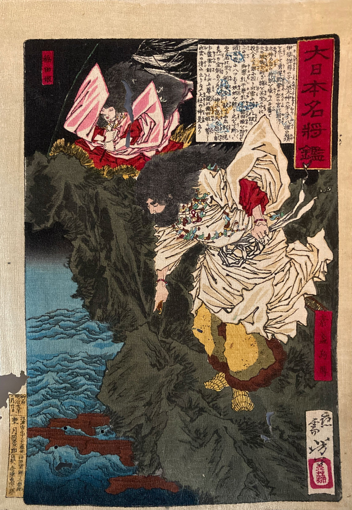Susanoo no Mikoto and Inadahime Awaiting the Eight-headed Serpent, from the series 'Mirror of Famous Generals of Japan (Dai nippon meisho kagami)'. After putting out eight barrels of sake, Susanoo waited until the serpent was drunk, then killed it. The series features images of warriors from throughout Japan's history with accompanying text.