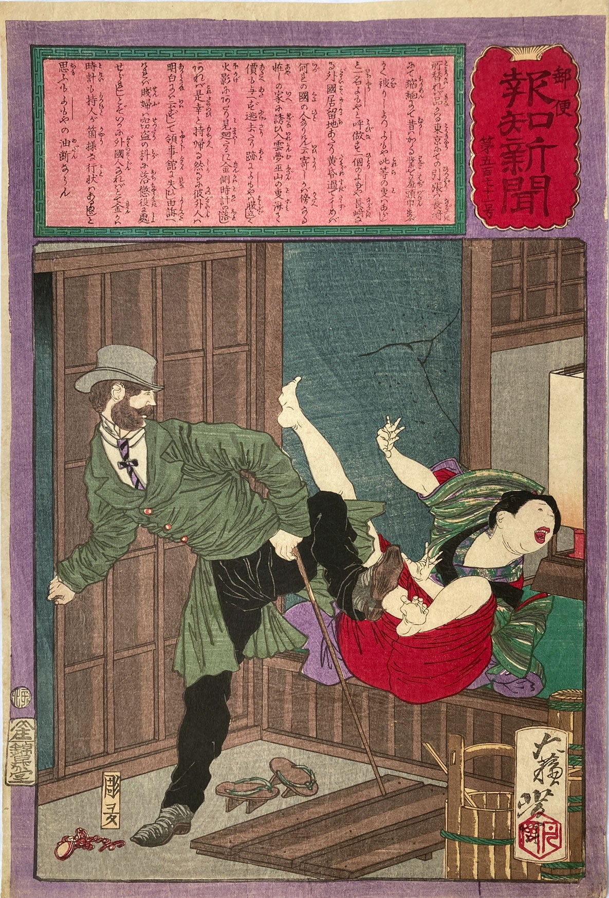 The Yūbin hōchi shinbun was a newspaper founded in June of 1873. In 1875, Yoshitoshi was hired to illustrate a wide variety of news subjects in full color. These prints were added as supplements, or furoku, for subscribers. This variety of print is referred to as Newspaper Nishiki-e" (新 聞 錦 絵, shinbun nishiki-e). The publisher of the Yūbin hōchi shinbun was likely motivated by the success of his competitor, the Tokyo Daily News (Tōkyō Nichinichi Shinbun) where Yoshitoshi's rival, Yoshiiku, was employed as an artist.