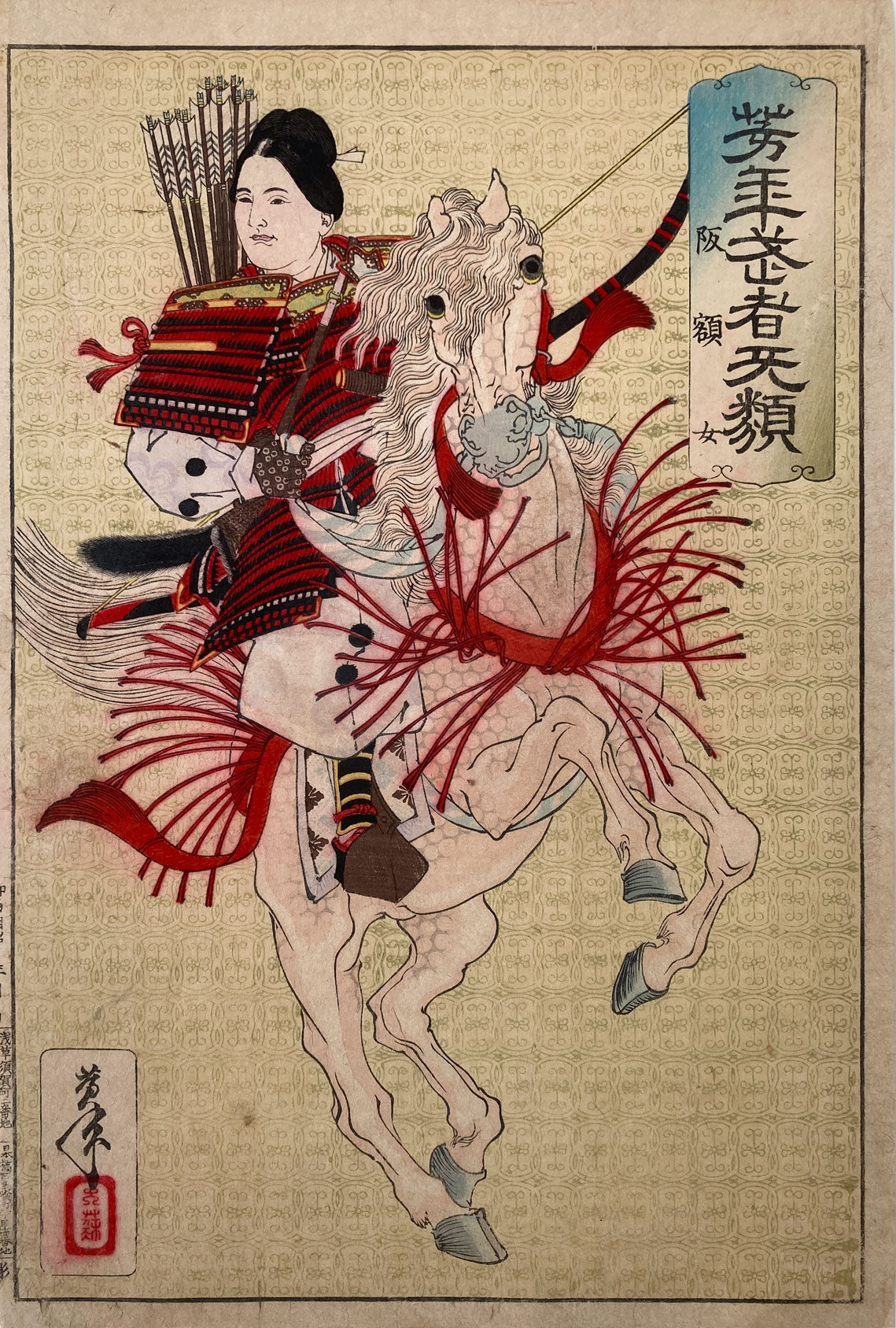 An impressive print of Hangaku, a Woman Warrior. From the series; Yoshitoshi's Courageous Warriors. A famous female general of the Genpei War, Hangaku Gozen. Hangaku allied with the Taira clan. The daughter of the samurai Jo no Sukemori, she raised an army in the 12th century to help overthrow the Kamakura Shogunate, but was defeated and sent to Kamakura for execution.