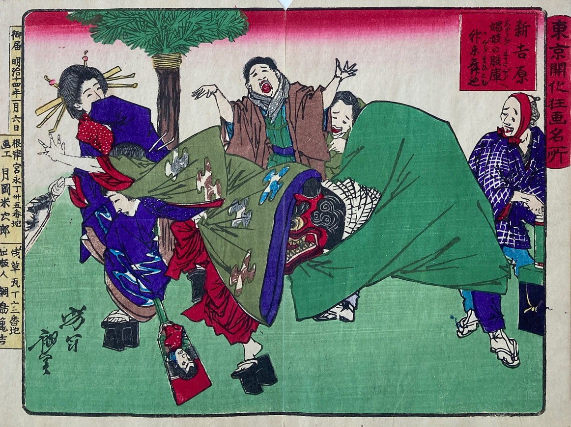 A lion dancer gets under a skirt at the New Yoshiwara. From the series "Crazy Pictures of Famous Places in Tokyo".