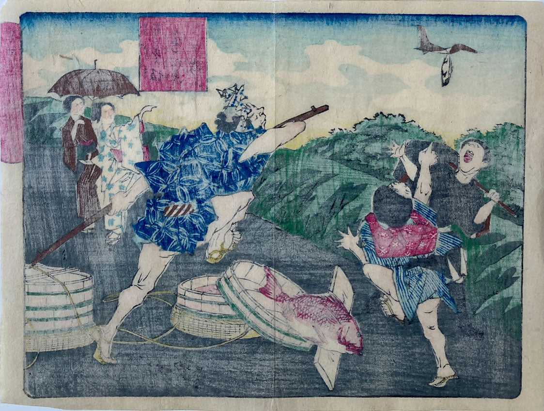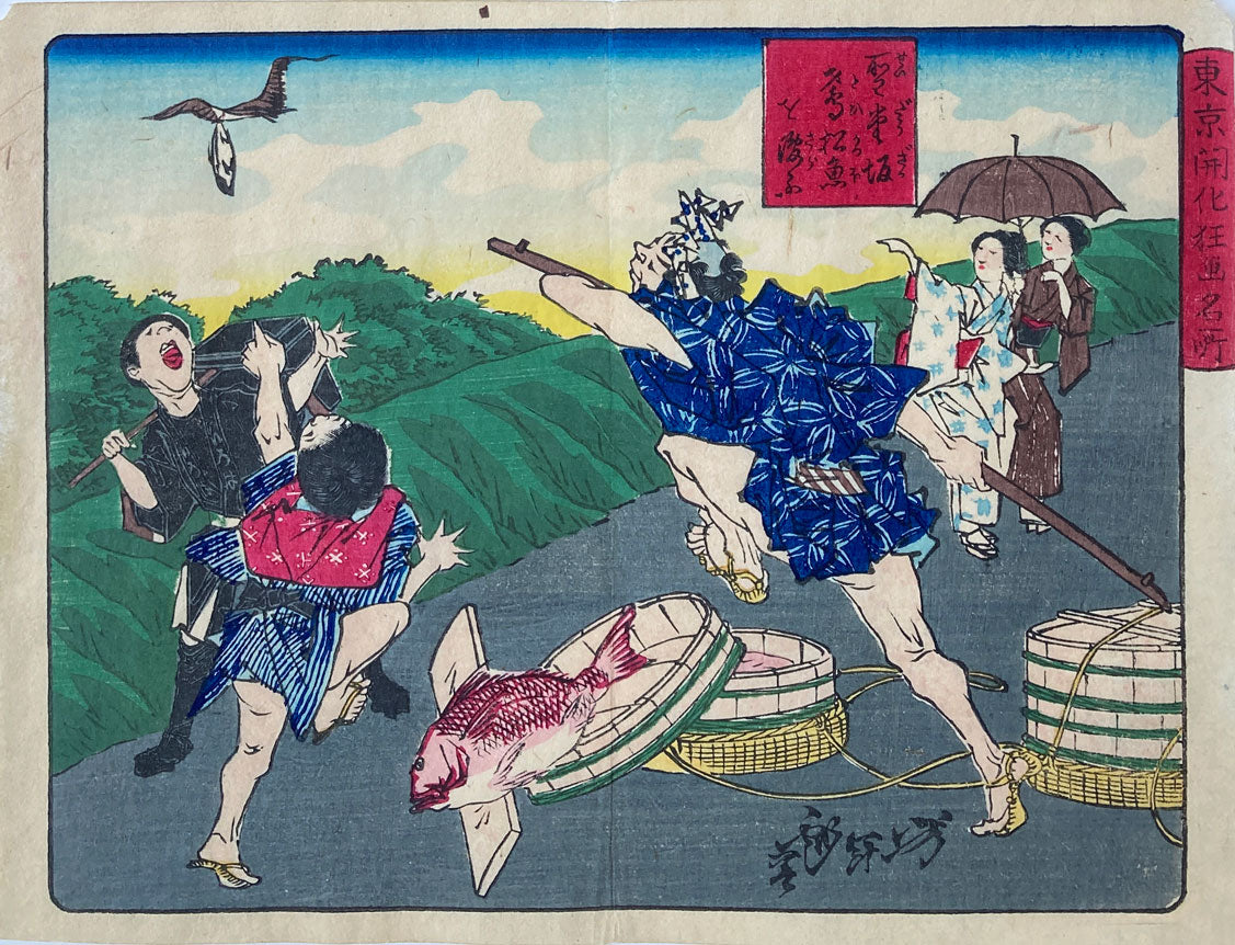 A kite (type of bird) flies off with a bonito at Seidozaka. From the series "Crazy Pictures of Famous Places in Tokyo".