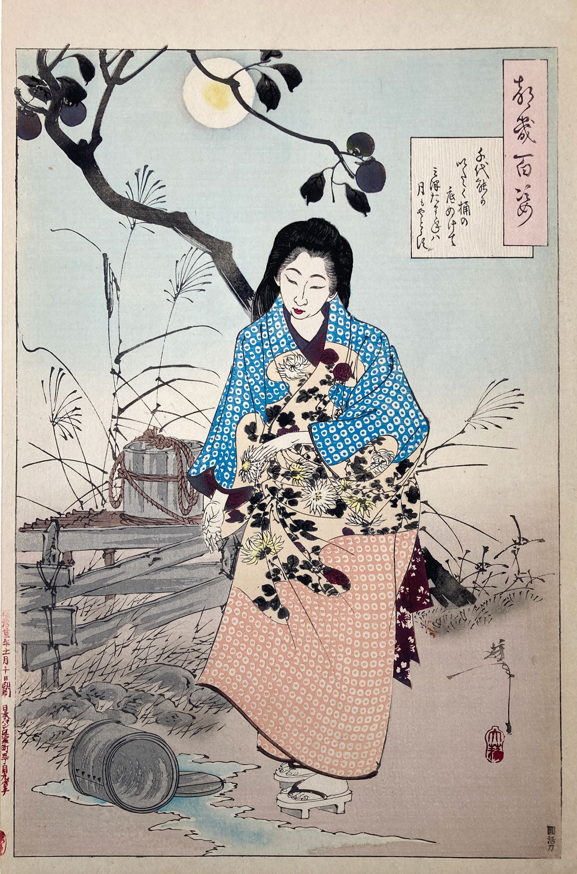 From his most famous series; One Hundred Aspects of the Moon: no. 74. The print and the poem in its cartouche depict the poetess Lady Chiyo (1703-1775) who started composing haiku at the age of fifteen. With guidance from the haiku master Shiko, she gained wide renown as a poet before becoming a nun in her fifties. The image of the spilling water references her most famous poem, composed after asagao (lit. morning face) tendrils grew around her water-bucket.