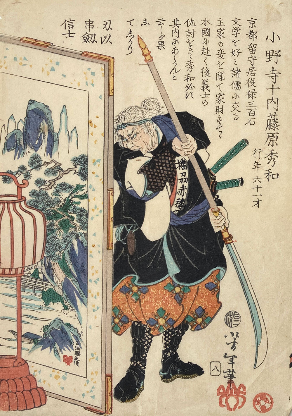 Print number 8, of warrior Onodera Junai Hidekazu [Onodera] concealed with naginata (pole sword) behind a painted screen. This is from the series "Historical Biographies of the Loyal Retainers" featuring portraits of each of the famous 47 ronin, accompanied by a biographical sketch. These prints show the samurai taking part in the night attack on Lord Kira's mansion. Yoshitoshi had just designed an oban format Forty-Seven Ronin series the previous year and was following in the footsteps of Kuniyoshi who was a master of musha-e (warrior prints).