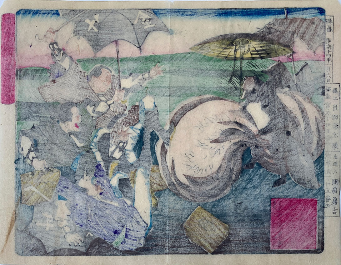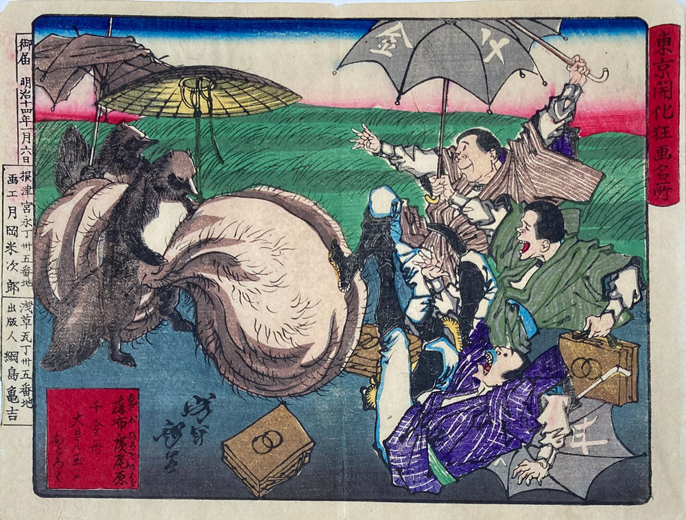 Travellers startled by a badger's gigantic scrotum at Hiroonohara, Azabu. From the series "Crazy Pictures of Famous Places in Tokyo".