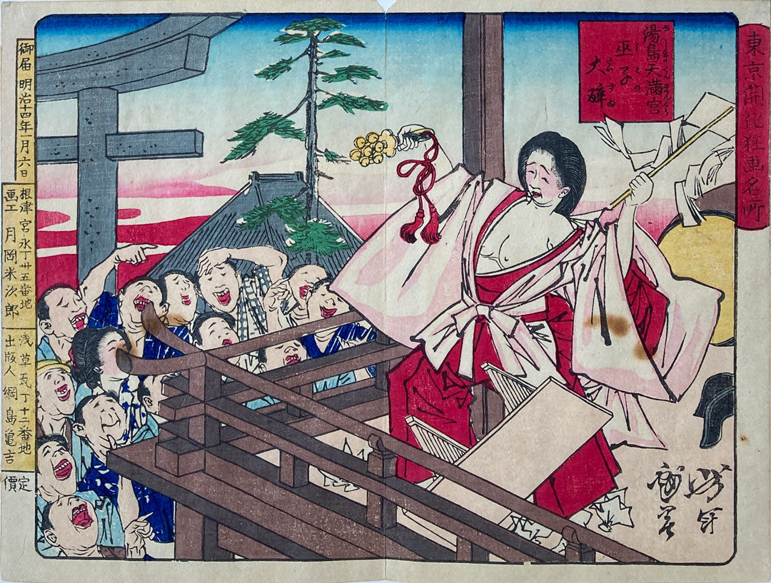 Drunken priestess at the Temmangu Shrine at Yanagishima. From the series "Crazy Pictures of Famous Places in Tokyo".